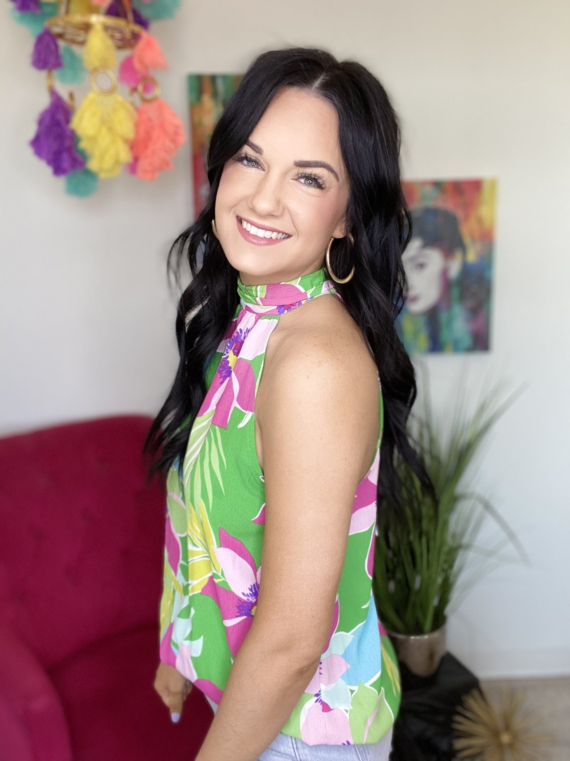 It'd be so easy to dream of summertime in this adorable halter top! The fun coloring and floral detailing makes sure of that! The flowy fit is truly flattering and that tied neckline is so precious! This tank features a halter neckline which ties in the back and a flowy fit.