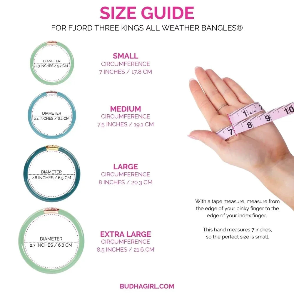 BuDhaGirl’s Three Kings All Weather Bangles ® (AWB ®) - Fjord are beautiful orbs that hold all of our extraordinary qualities…they are weightless, soundless, waterproof, and TSA proof while being amazingly glamorous. Each set has our exclusive Lotus prayer bead in yellow gold, white gold, and rose gold…thus the name Three Kings, paying tribute to the three hues of gold.