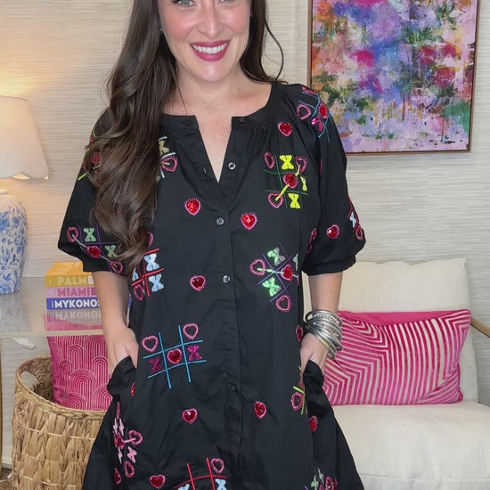Game on for style with this playful black cotton dress from Queen of Sparkles! Featuring a clever tic tac toe board design adorned with sequins and embroidered XOXO details, this button-up dress is pure fun meets fashion. The soft cotton fabric keeps you comfortable all day long, while the whimsical game-inspired embellishments add personality and sparkle. Perfect for anyone who loves a little sass and shimmer, this dress works beautifully for casual outings, themed events, or whenever you want to show off your playful side. It's the kind of piece that starts conversations and spreads smiles!