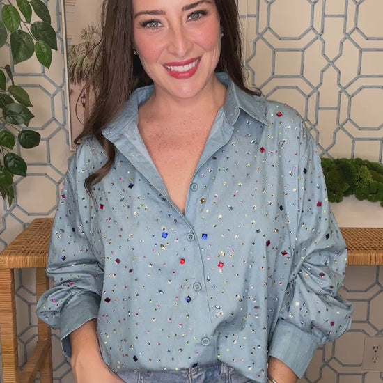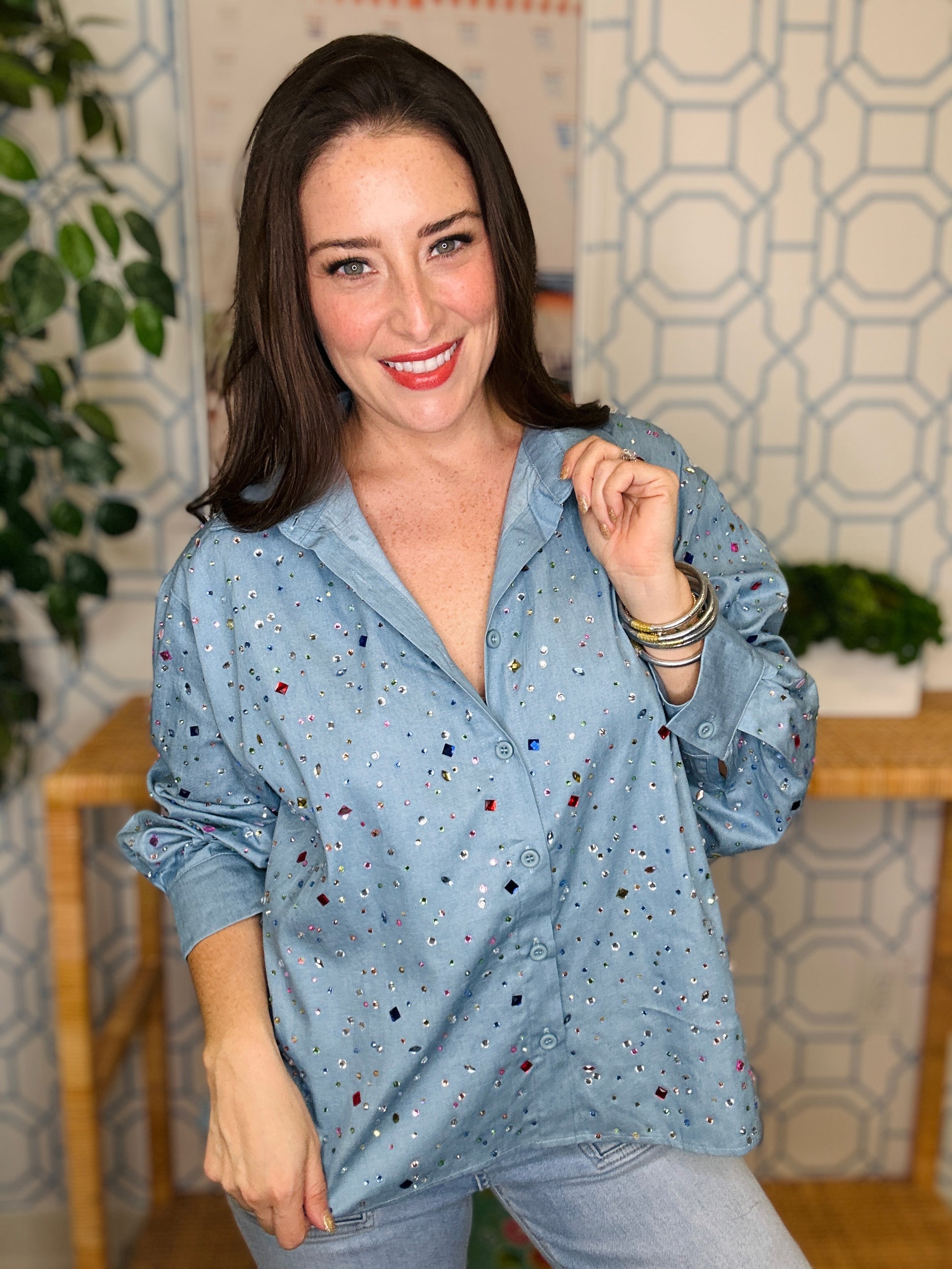 Elevate your casual style with this Queen of Sparkles chambray button-up, where classic meets glam. Adorned with sparkling rhinestones that catch the light with every move, this piece transforms a timeless chambray into something truly dazzling. Perfect for layering or wearing solo, it's the ideal way to add a little extra shimmer to your everyday look. Comfortable, versatile, and absolutely show-stopping—because who says you can't sparkle while keeping it cool and casual?