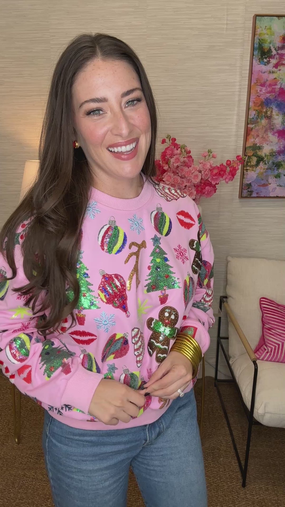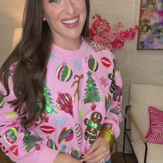 Get into the holiday spirit with the QOS Christmas Icons Sweatshirt. This soft, cozy light pink sweatshirt features charming festive icons, adding a whimsical touch to your winter wardrobe and keeping you comfy all season long.