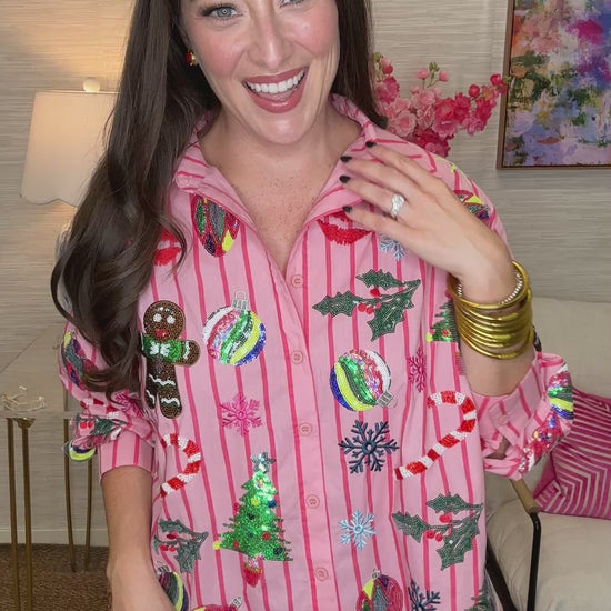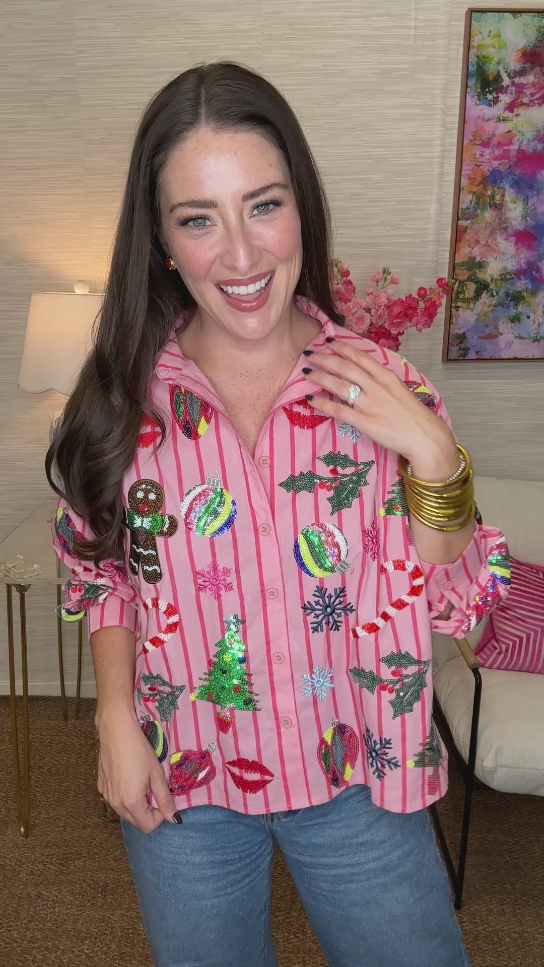 The light pink button up top features vibrant red stripes and playful sequin Christmas Icons scattered all over adding a festive sparkle to you holiday wardrobe.