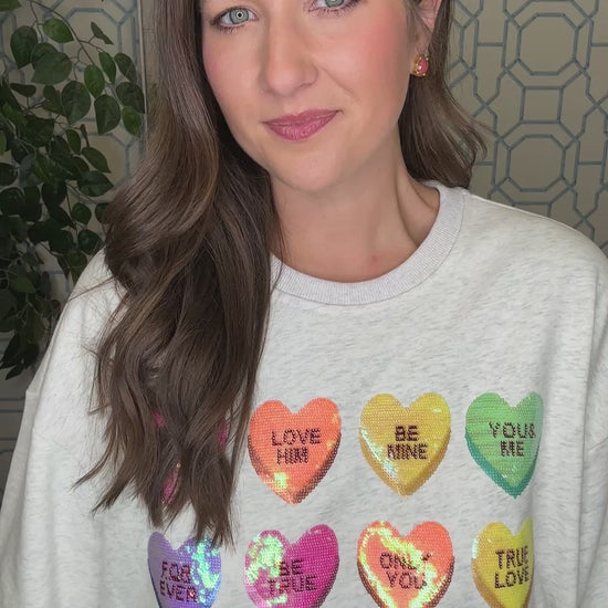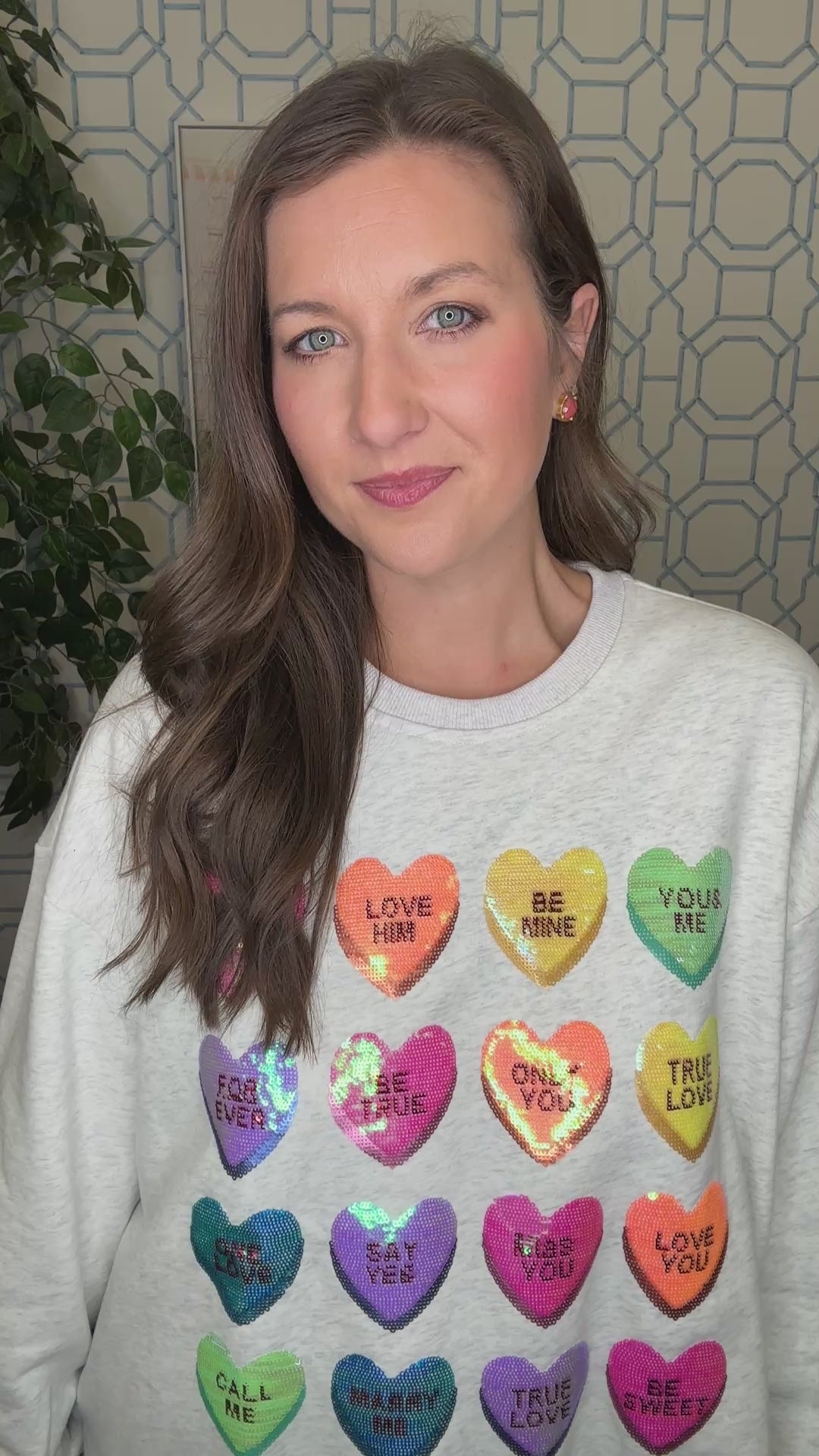 The QOS Light Grey Sweetheart Sweatshirt is absolutely adorable. This queen-of-sparkles creation features charming conversation heart details that bring all the sweetness and fun. Soft, cozy, and impossibly cute, it's the kind of sweatshirt that makes you smile every time you slip it on. Perfect for expressing your playful side, this light grey beauty is ready to become your new favorite go-to piece for casual comfort with a whole lot of heart.
