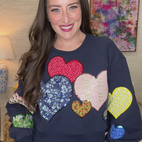 Sparkle like royalty in this navy sweatshirt from Queen of Sparkles! Featuring adorable patchwork embroidered hearts scattered across the chest, this cozy layer brings whimsical charm to your everyday wardrobe. The soft, comfortable fit makes it perfect for lounging or casual outings, while the intricate heart details add that special touch of personality. Whether you're a sparkle enthusiast or just love cute, heartfelt style, this sweatshirt is your new go-to piece for spreading joy and glitter vibes wherever you go.