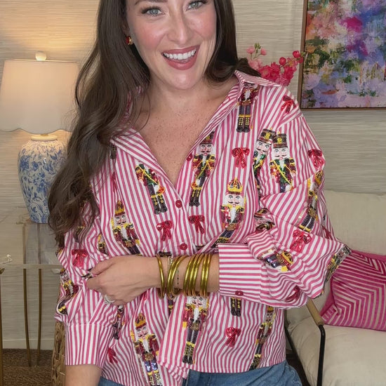 Add a lively twist to your outfit with the QOS Nutcracker & Bow Top. Featuring bright red stripes and a whimsical scattered nutcracker and bow pattern, this cotton button-up brings festive cheer to any look. Perfect for celebrating the season in style, it pairs comfort with playful holiday spirit.
