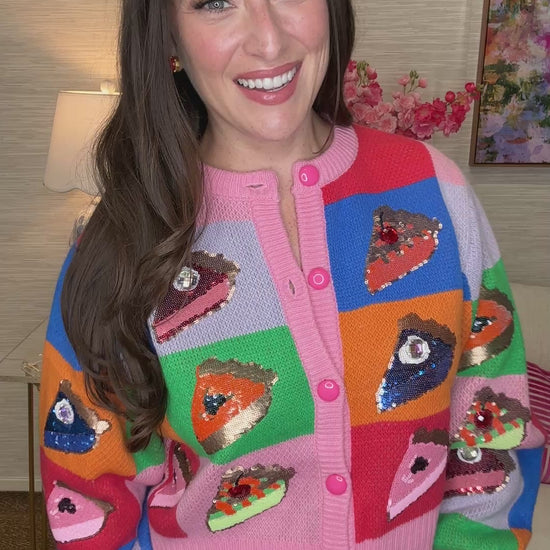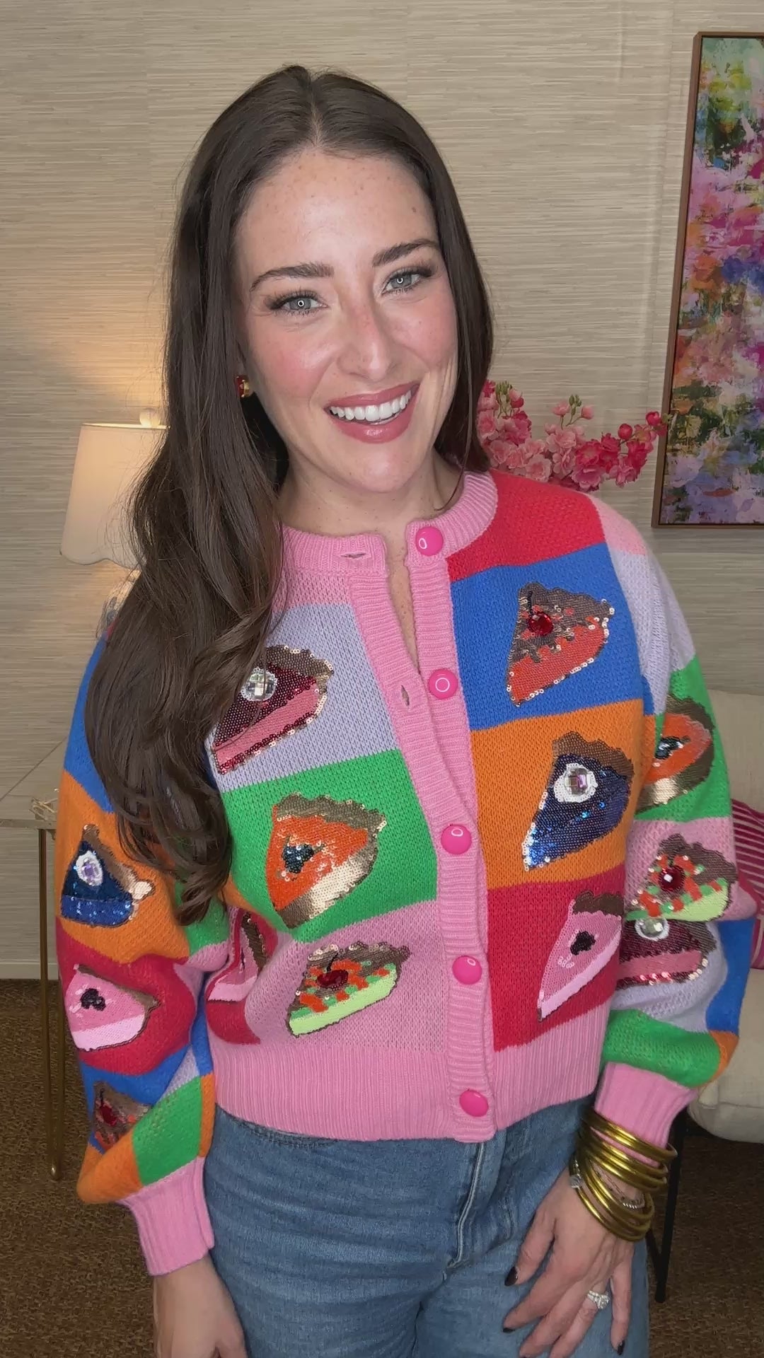 Add a splash of fun to your holidays with the QOS Piece Of Pie Sweater. This playful button-up features bright, rainbow colorblocks that blend as delightfully as your favorite slice of pie. Cozy and cheerful, it’s the perfect way to brighten up any festive outfit.