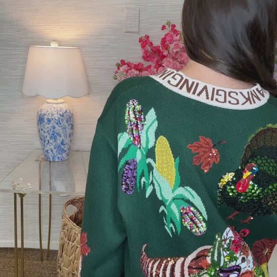 Embrace the festive spirit with this dark green cardigan, featuring a charming "Thanksgiving" Border design. Playful sequined turkeys and delicate floral details add a touch of whimsy, while the slightly oversized fit keeps you cozy and comfy for all you holiday gatherings.