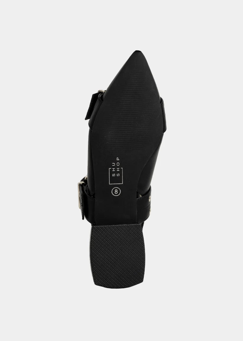 Sharp. Structured. Unapologetically cool. The ANGELA in Black is a modern flat that doesn't play it safe. With bold oversized buckle straps, a pointed toe, and slingback silhouette, this pair blends edge and polish in equal parts. Whether you're styling it for the office or after-hours, it brings instant attitude to your everyday look-no heels required. Because flats can be just as fierce.