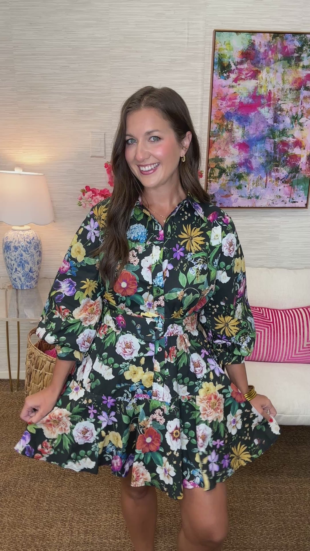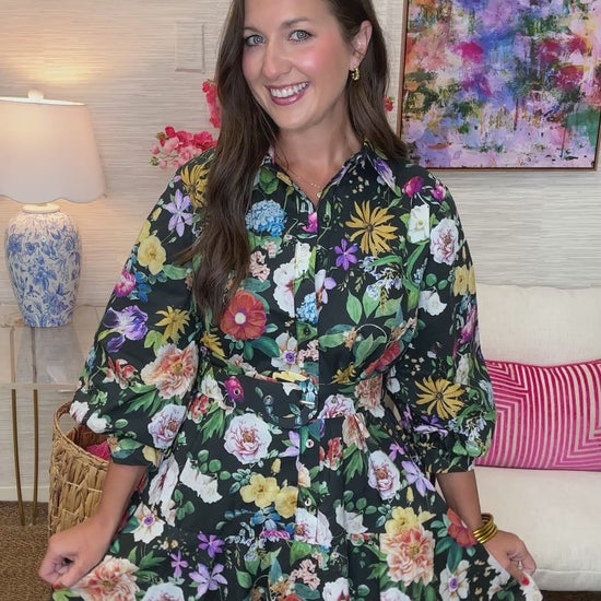 Add a dash of joy to your day with The Be You Dress. Featuring playful 3/4 inch balloon sleeves, a half-button-up front, and a flattering belt, this black dress bursts with bright floral patterns. The slight ruffle at the bottom adds a fun, flirty finish, making it perfect for those who want to stand out with charm and confidence.