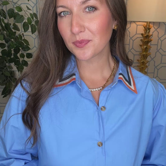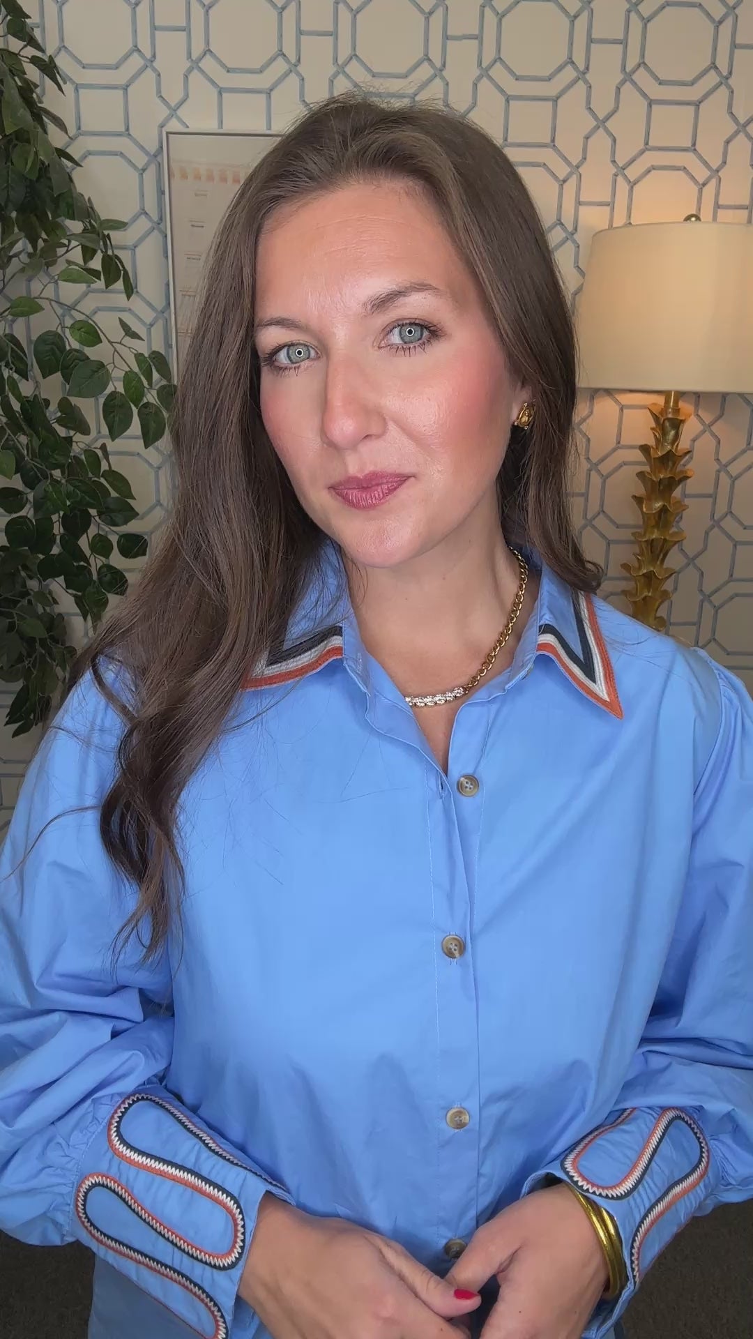 Introducing The Bella Blue Blouse—a show-stopping piece that's equal parts elegance and fun! This gorgeous button-up features an intricately embroidered collar that frames your face beautifully, while dramatic embroidered cuffs on the long sleeves add serious flair to every gesture. Perfect for turning heads at brunch, the office, or anywhere you want to make a stylish statement. Elevate your everyday wardrobe with this charming, conversation-starting essential.