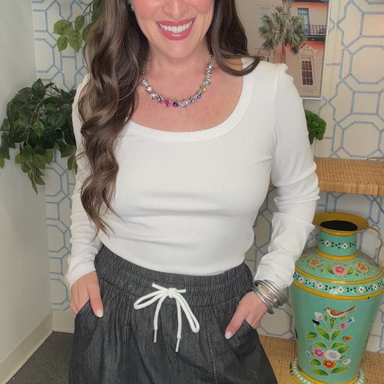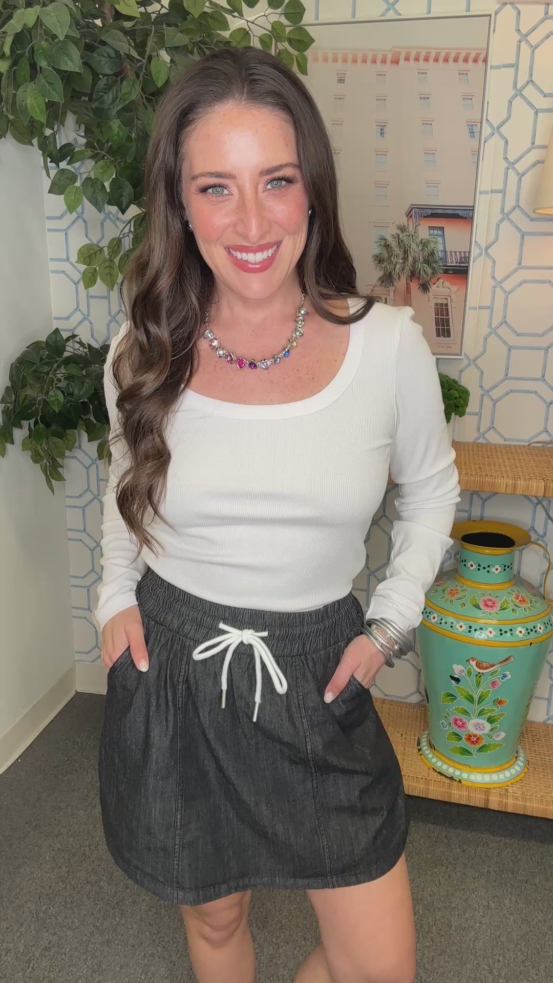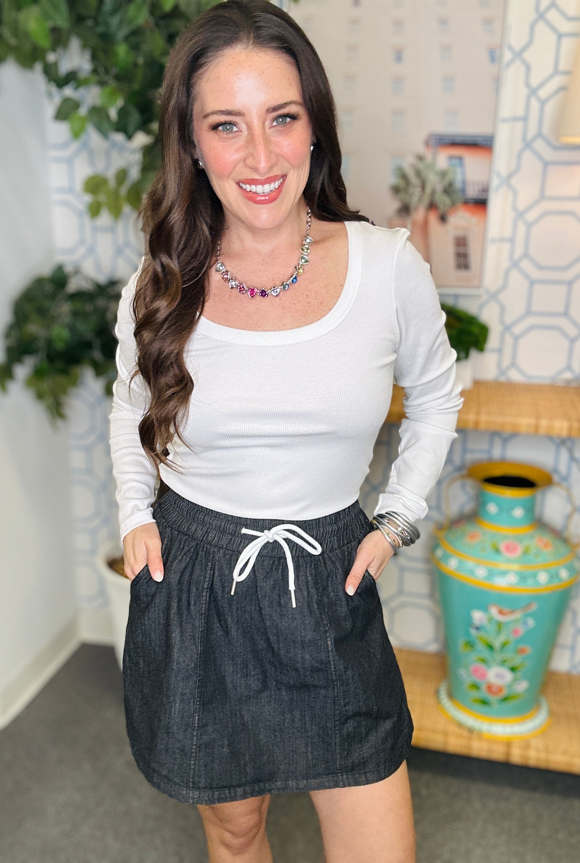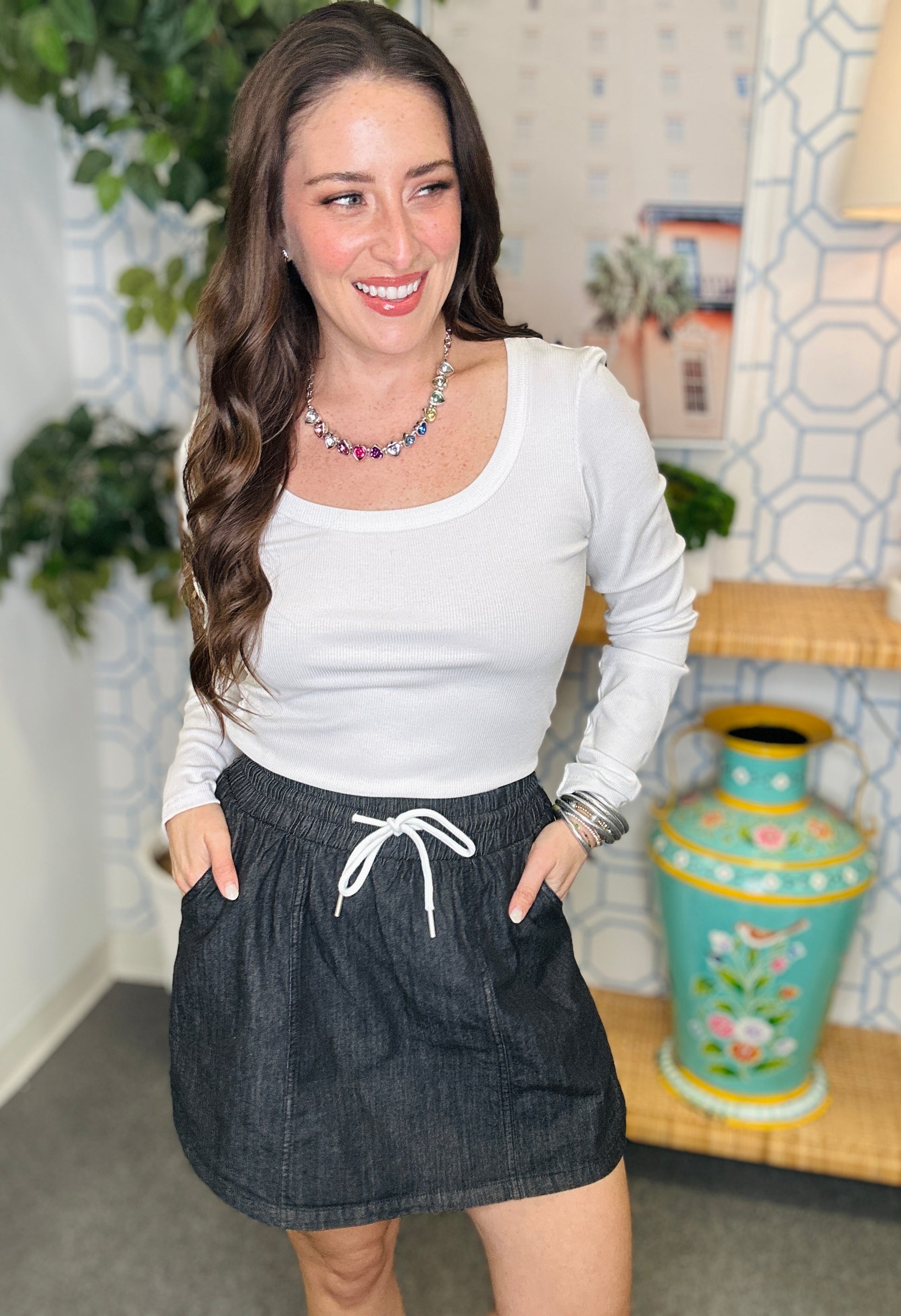 The Denim Black Skort is the perfect blend of classic and casual. This versatile denim piece features practical front pockets—because who doesn't love a skirt that actually holds your stuff—and a white drawstring waist that adds a fun pop of contrast. Whether you're going for a sporty vibe or just want something comfortable and cute, this skort delivers effortless style. Pair it with your favorite tee, sneakers, or dress it up for a playful twist on timeless denim.