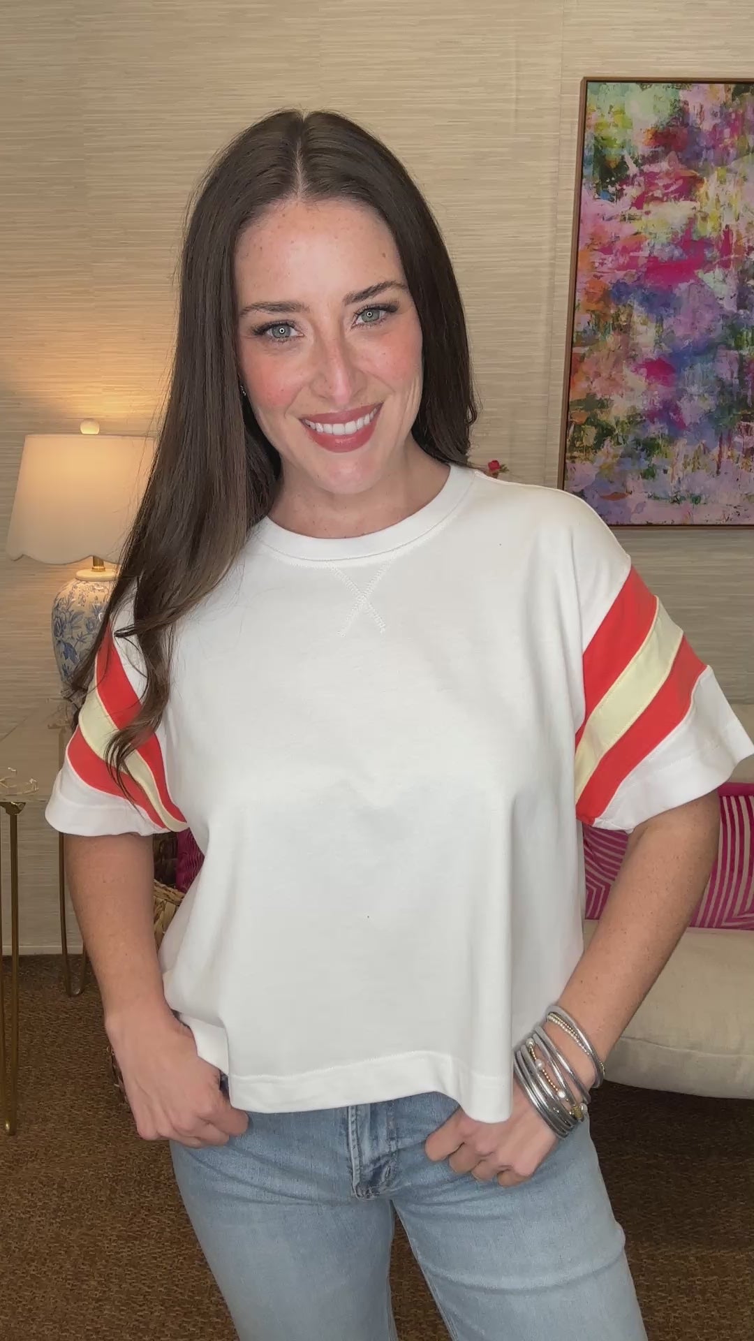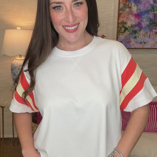 The Blake Block Top is athletic style meets playful fashion. This sporty crop tee features short sleeves with stitched contrast color stripes that add visual interest and a fun edge to your casual look. Available in two versatile colors, it's the perfect piece for gym sessions, weekend errands, or whenever you want to feel active and adorable.