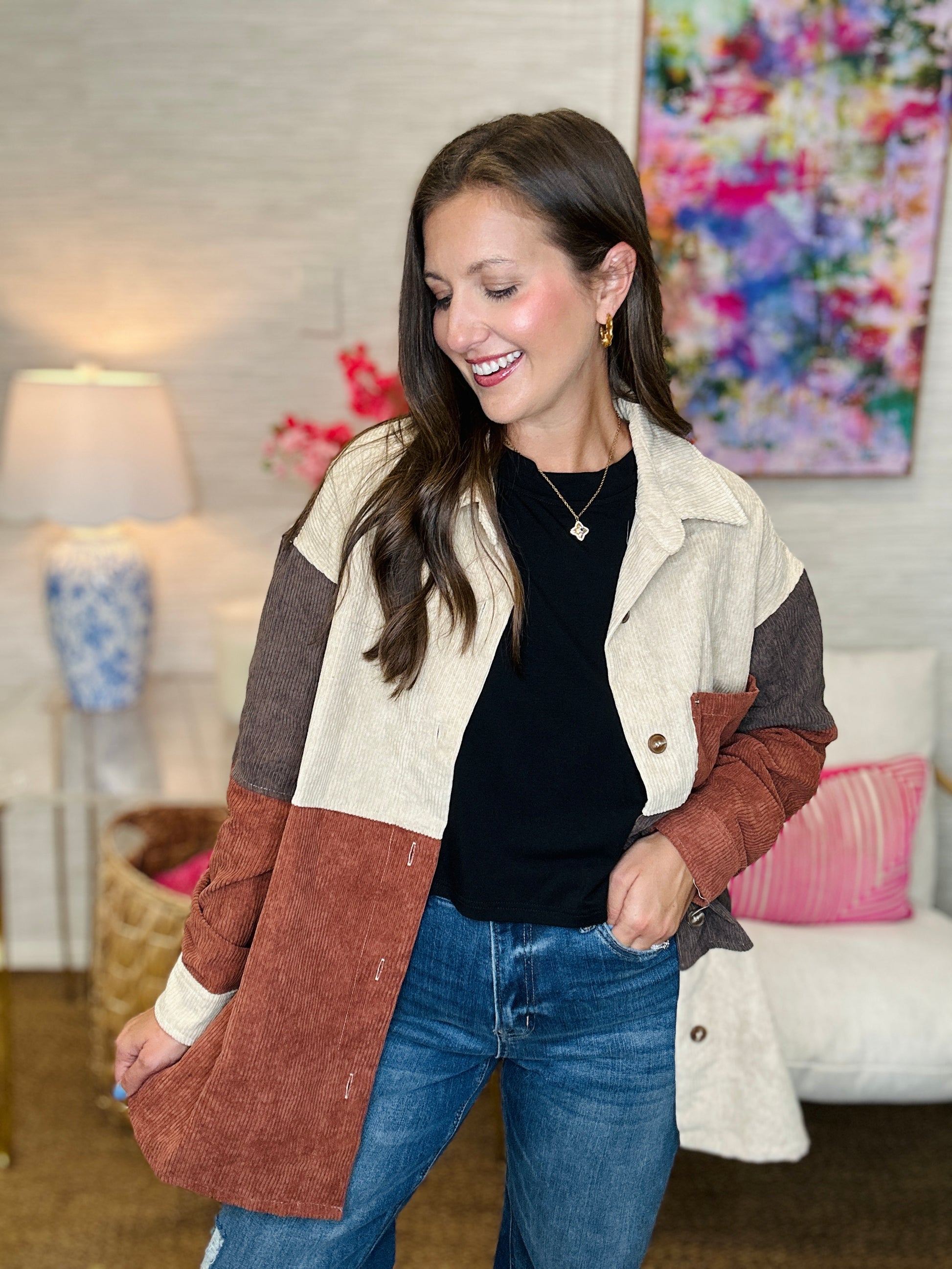 Introducing the Block Cord Shacket, the perfect blend of shirt and jacket. This unique piece is available in two colors and features a bold blocked cord design. Stay stylish and warm with this versatile shacket.