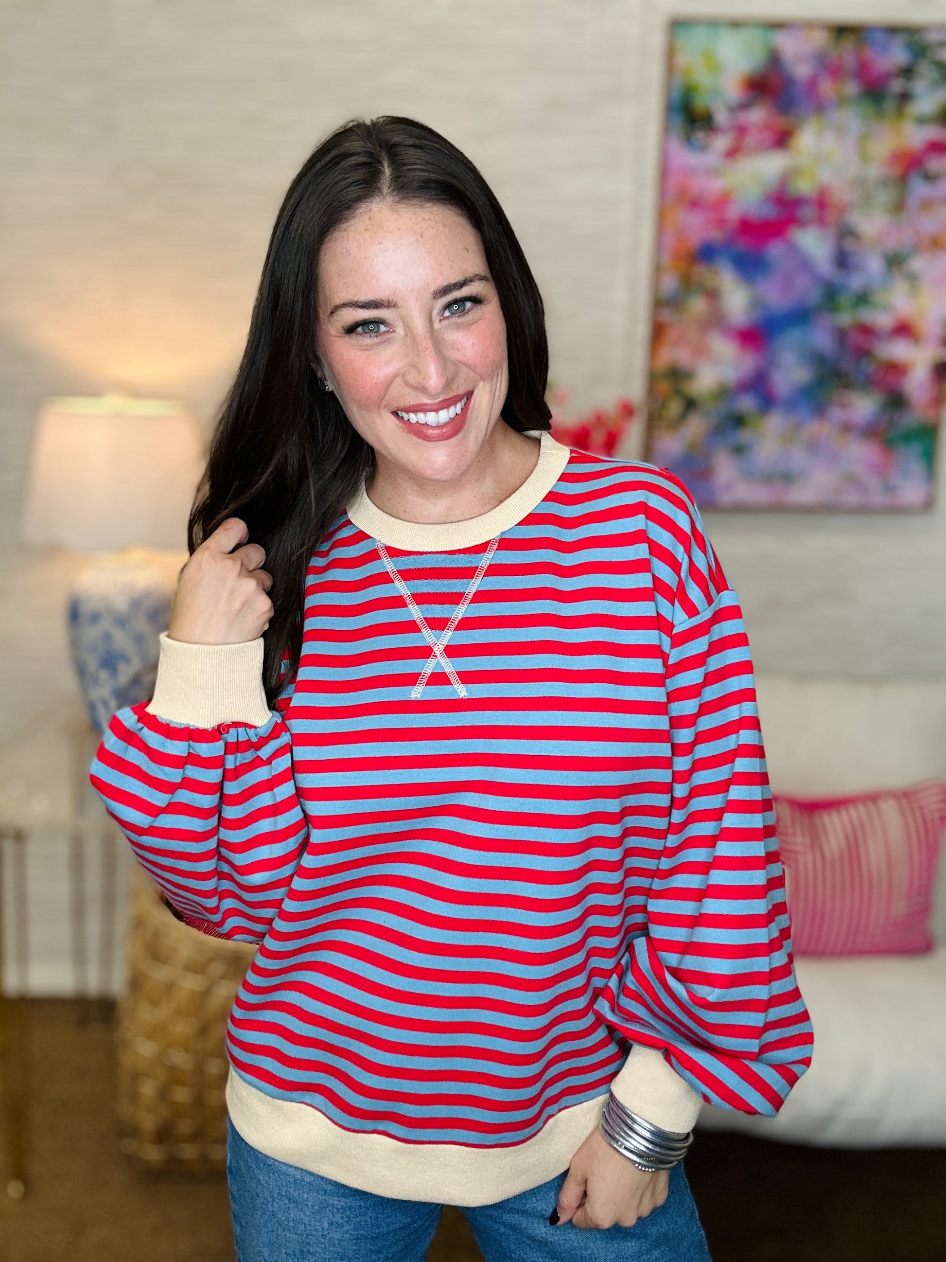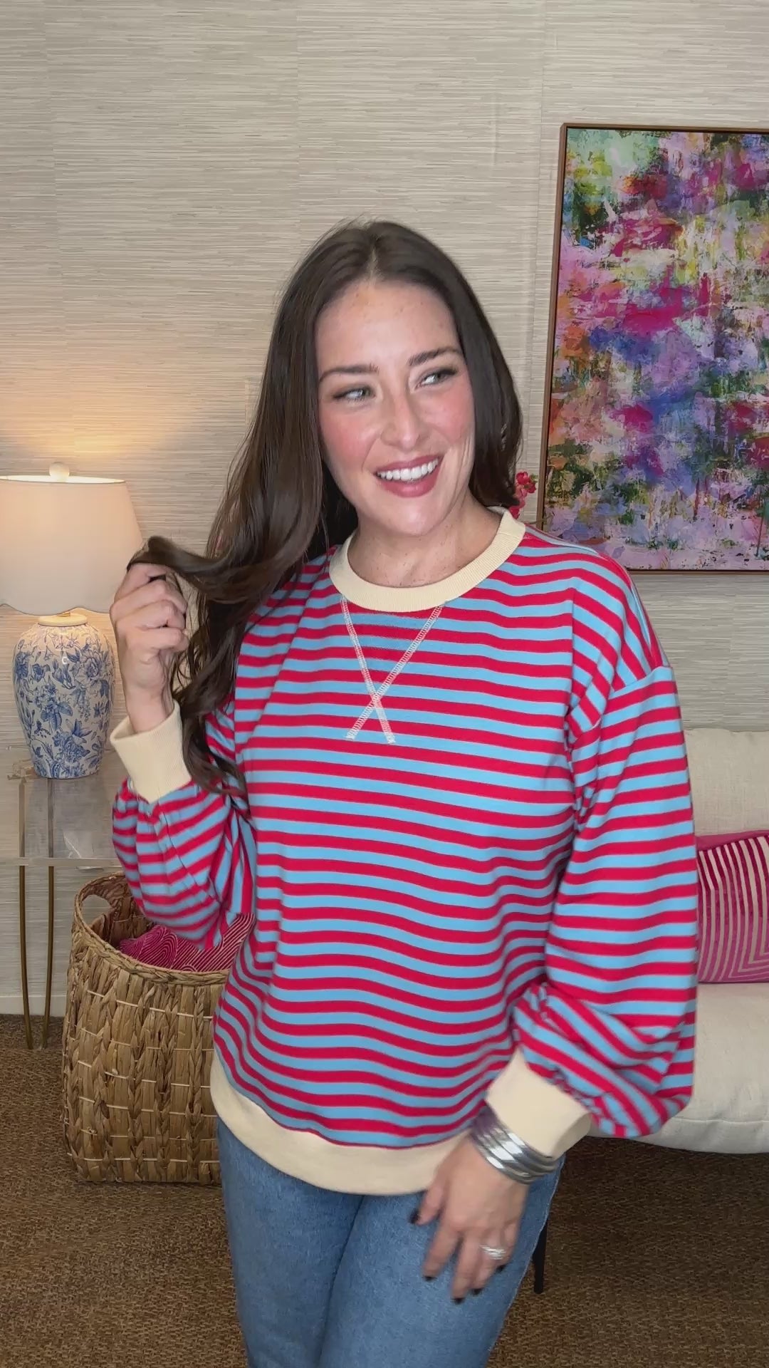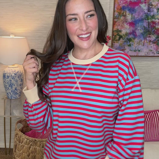 Embrace cozy style with The Bruiser Pullover—an oversize fit. Playful pops of contrasting blue trim on the hem, neckline, and cuffs add a fresh twist, making it perfect for relaxed days with a splash of fun.