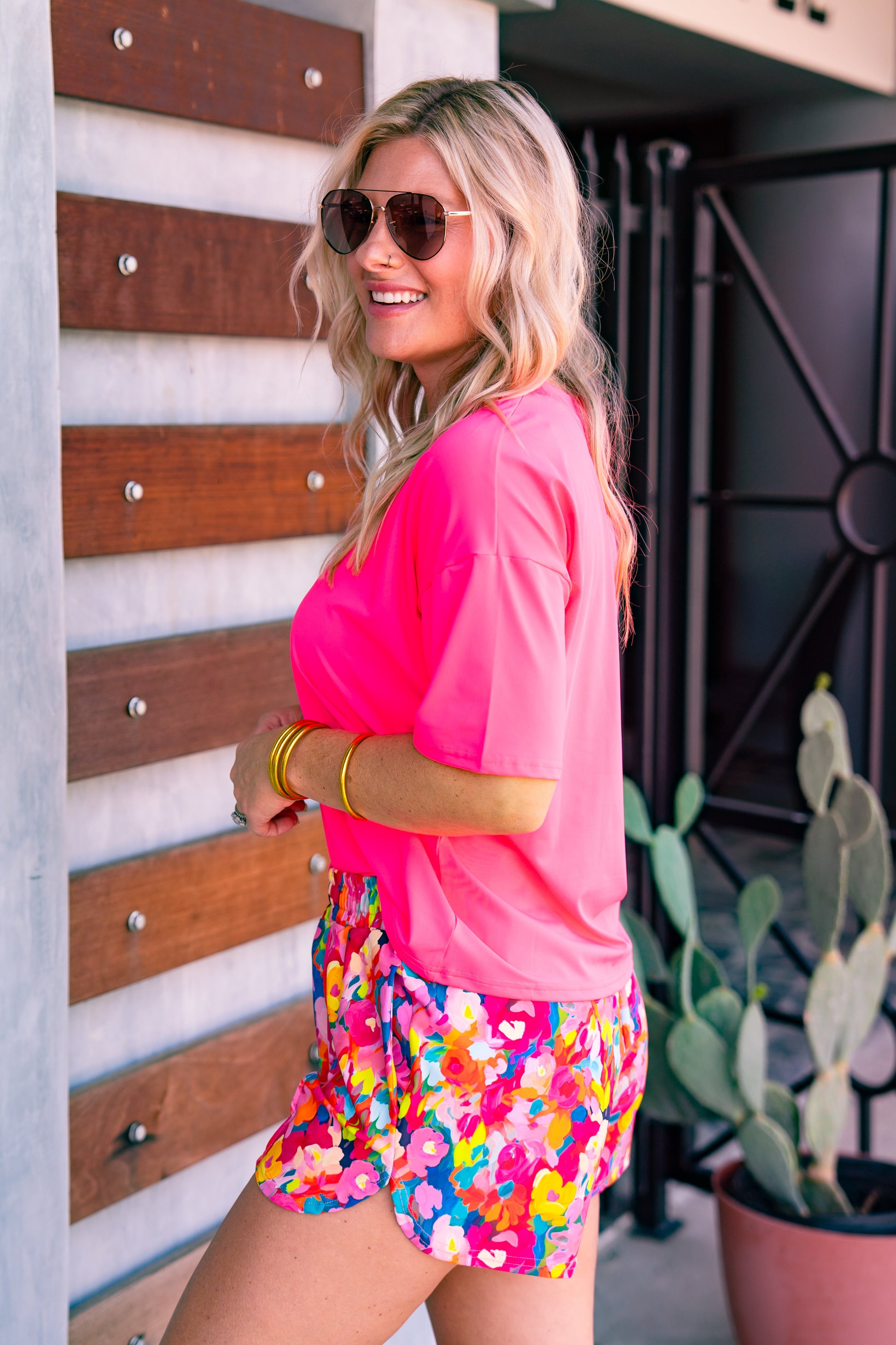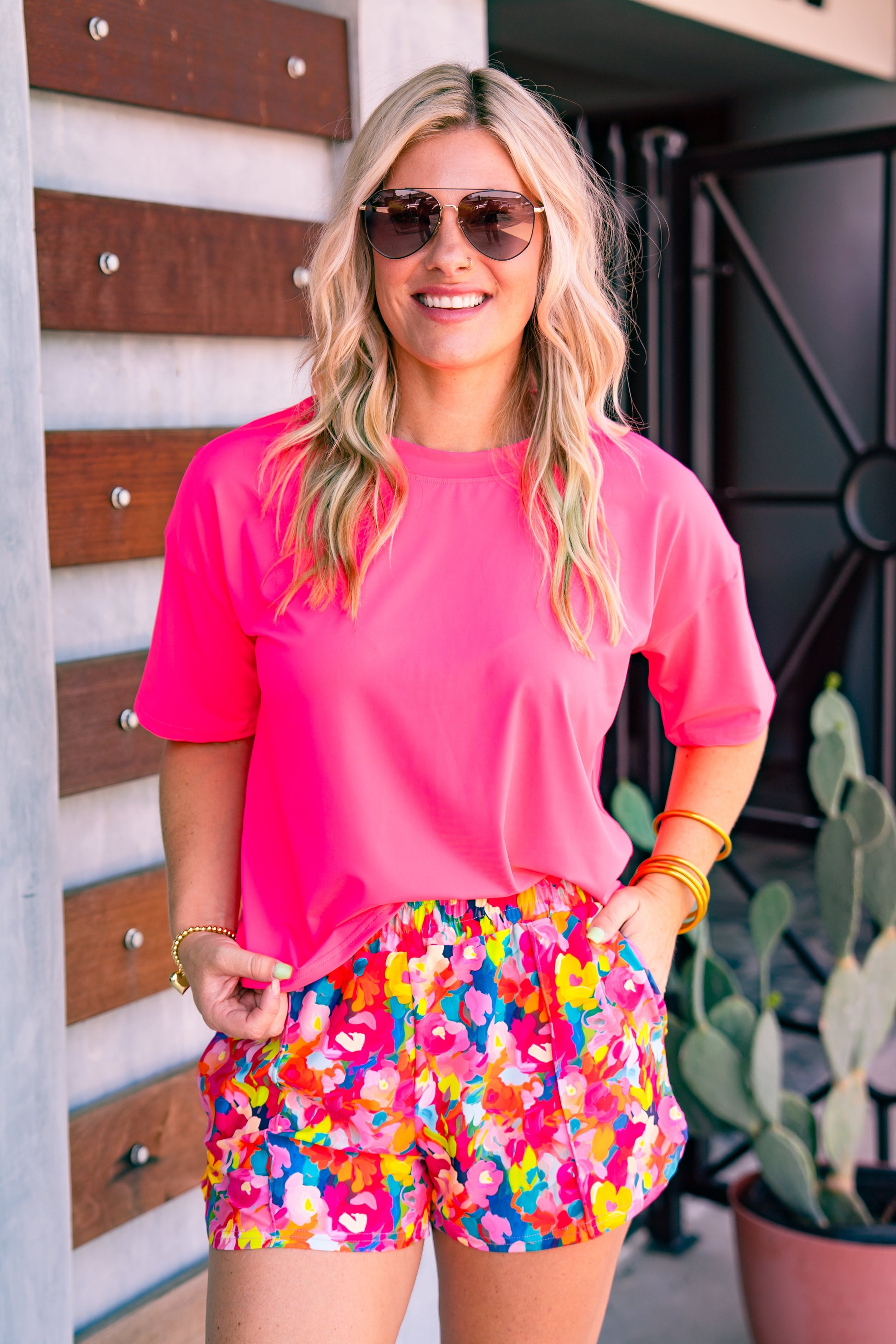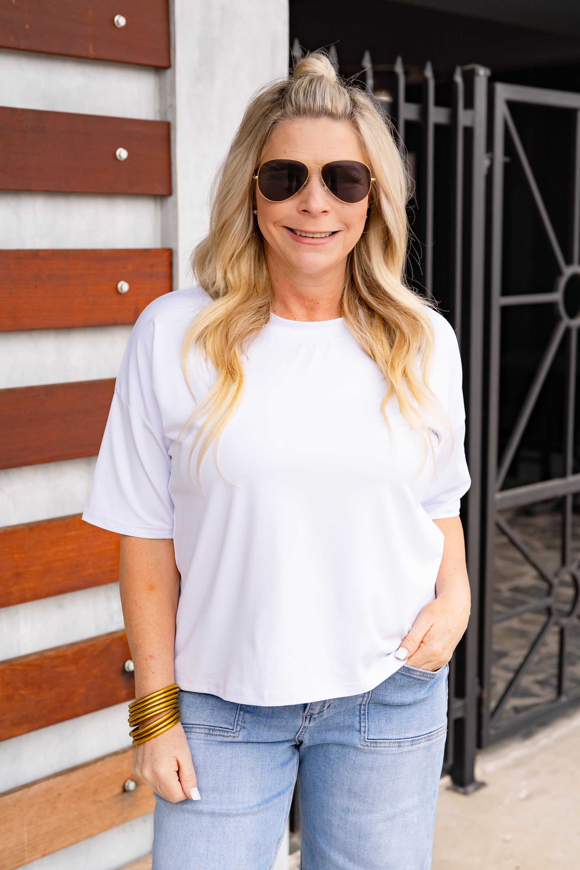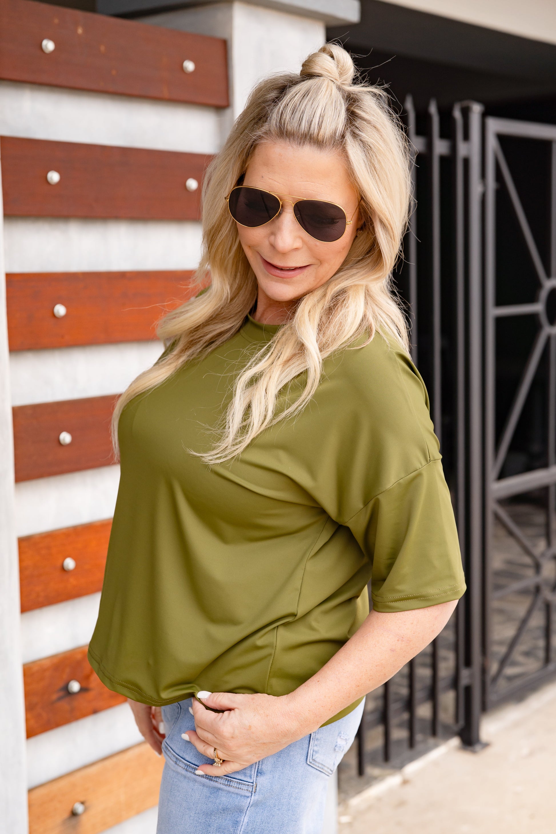 Ashley is a size 4/6, wears a small in tops, and wears a Medium in this tee.