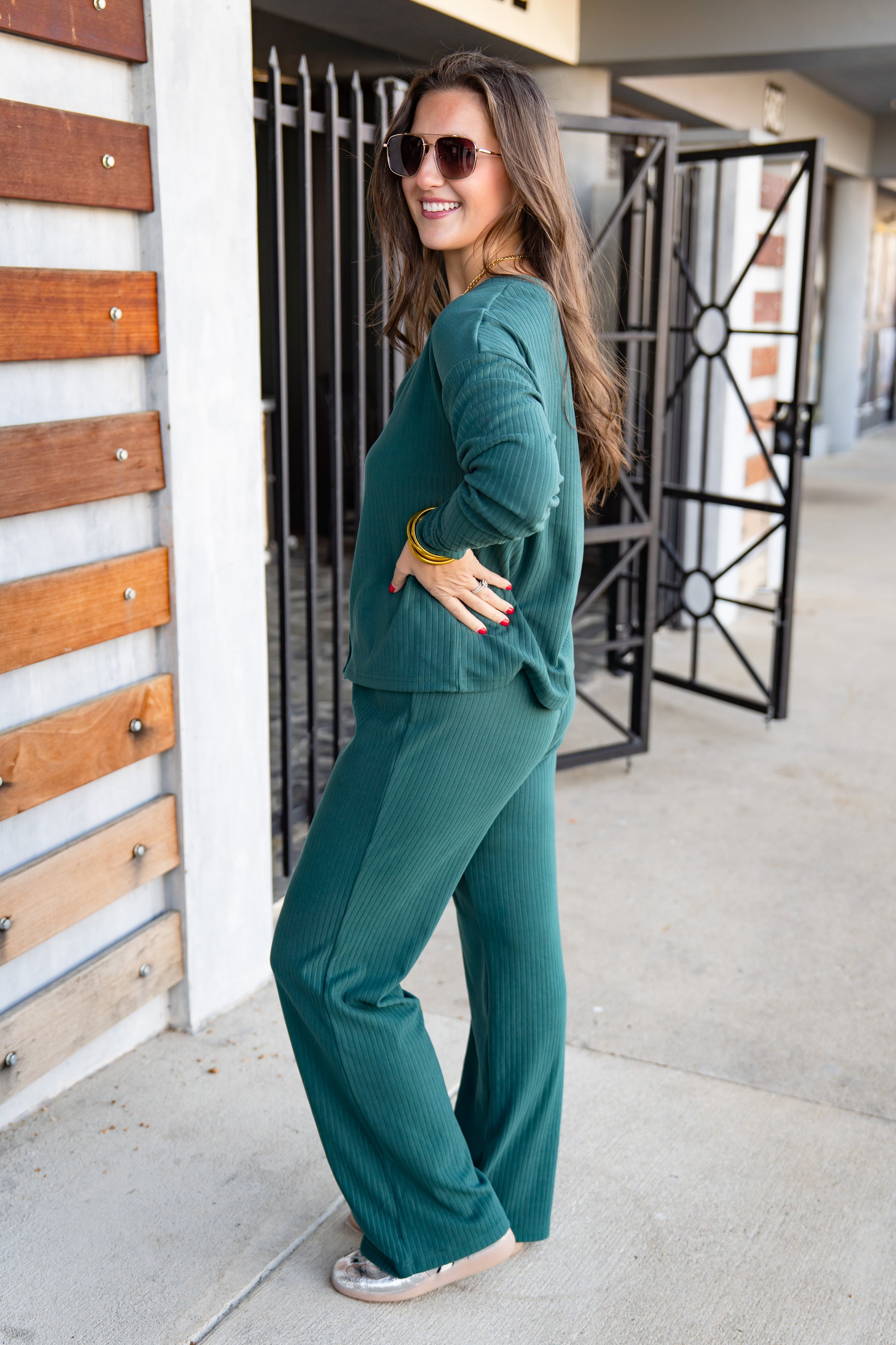 An easy, everyday lounge set made from a soft ribbed knit that feels as good as it looks. Featuring a relaxed, button-front top with a flattering V-neck and matching wide-leg pants for an effortless fit. The pants have an elastic waistband with no drawstring. Comfortable enough for lounging, polished enough to wear out—this set is a must-have in multiple colorways.