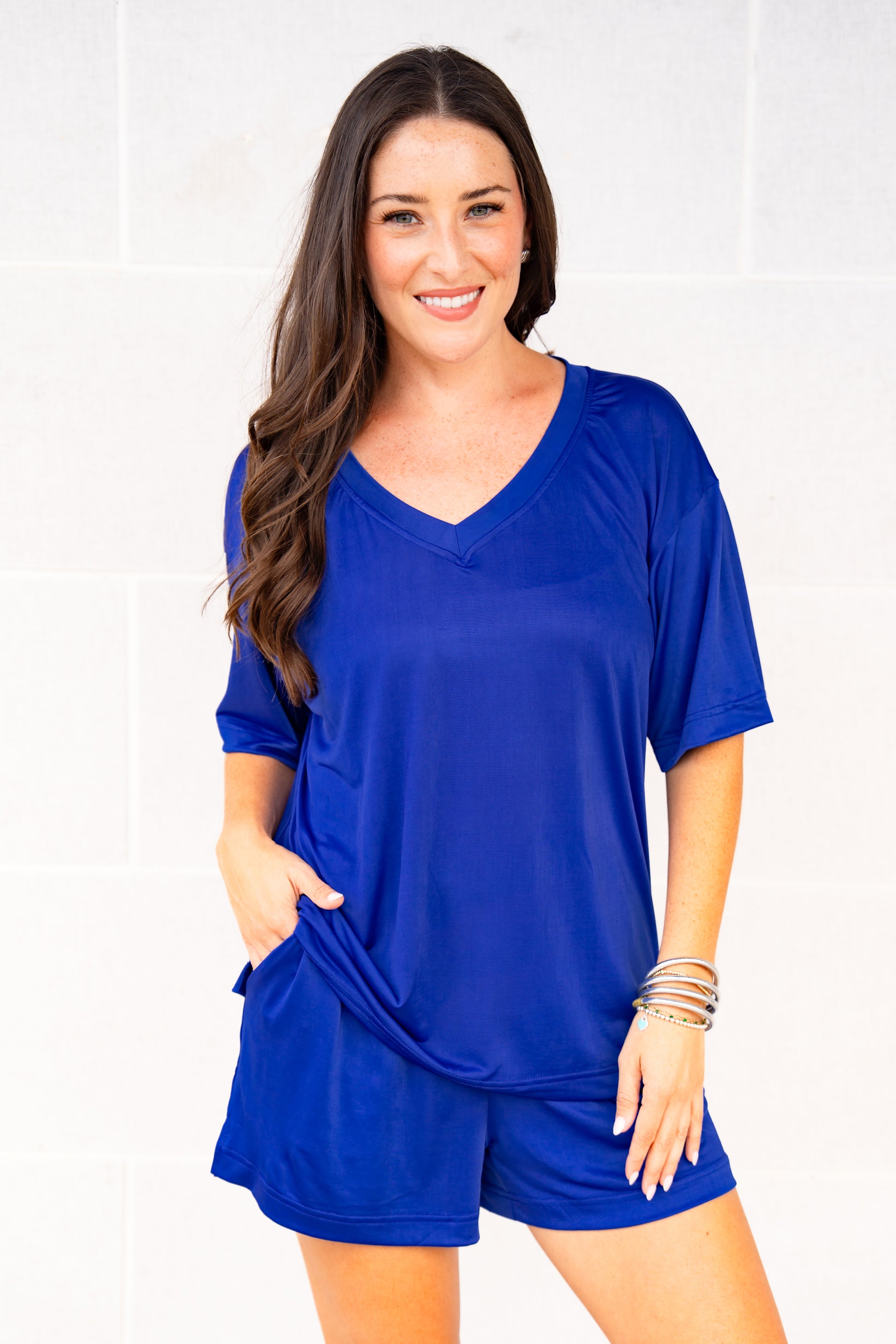 Get ready to lounge or step out in style with the Buckley Lindsey Set. This PJ features a v-neck top with breezy longer short sleeves and cute side slits for extra comfort. The shorts boast a super stretchy elastic waistband—no fuss, no drawstring—and handy pockets to keep your essentials close. Perfect for sunny days and easygoing vibes!