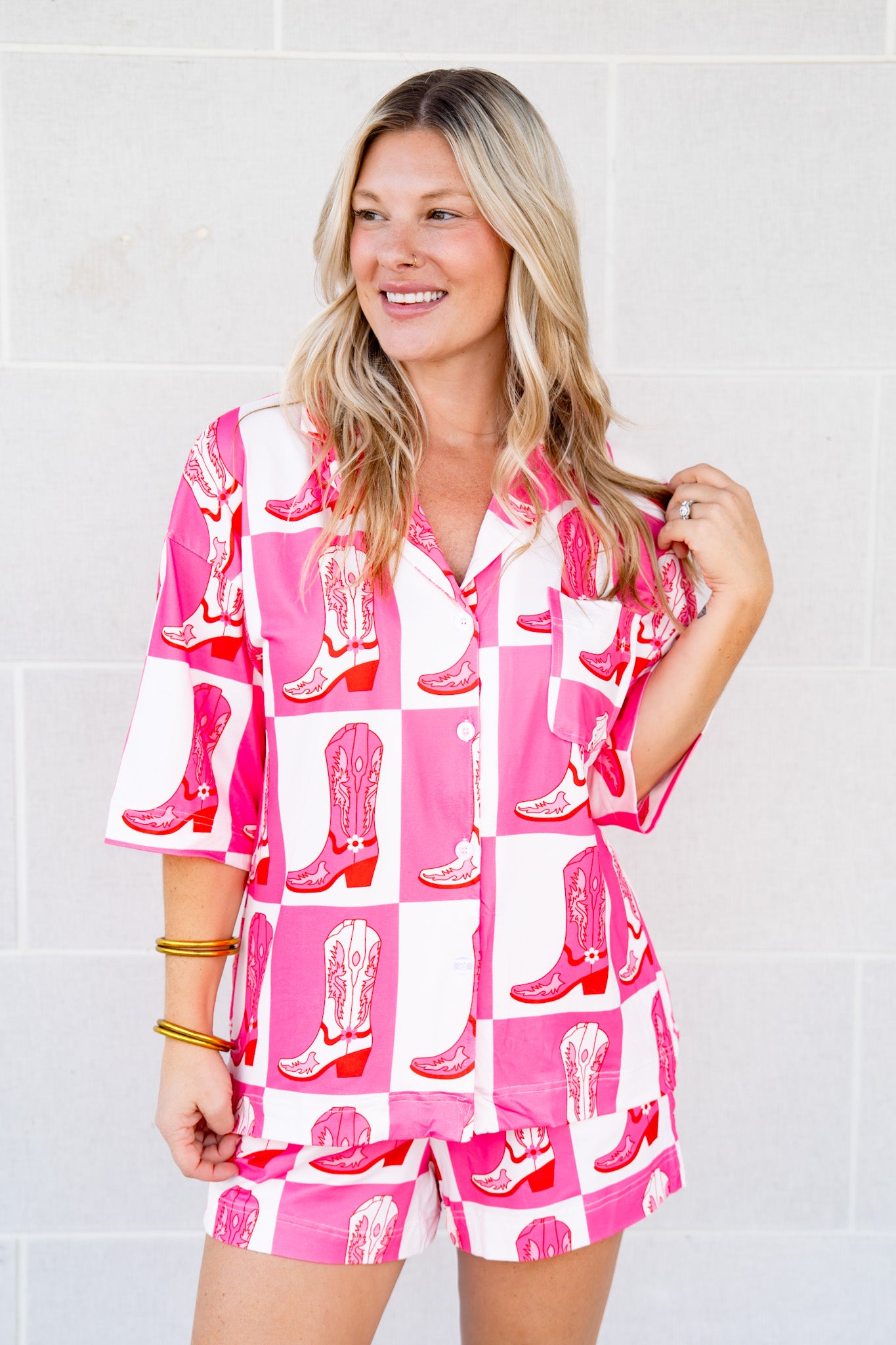 The Morgan Pajama Set is a cozy twist on our classic Harrison set, featuring an easy button-down top with clear buttons and an extra-relaxed fit. With even longer short sleeves for added coverage, it’s perfect for lounging in ultimate comfort. The matching shorts have a soft elastic waistband and functional pockets, making them as practical as they are stylish. Whether you're unwinding at home or enjoying a slow morning, the Morgan set is your go-to for effortless relaxation.