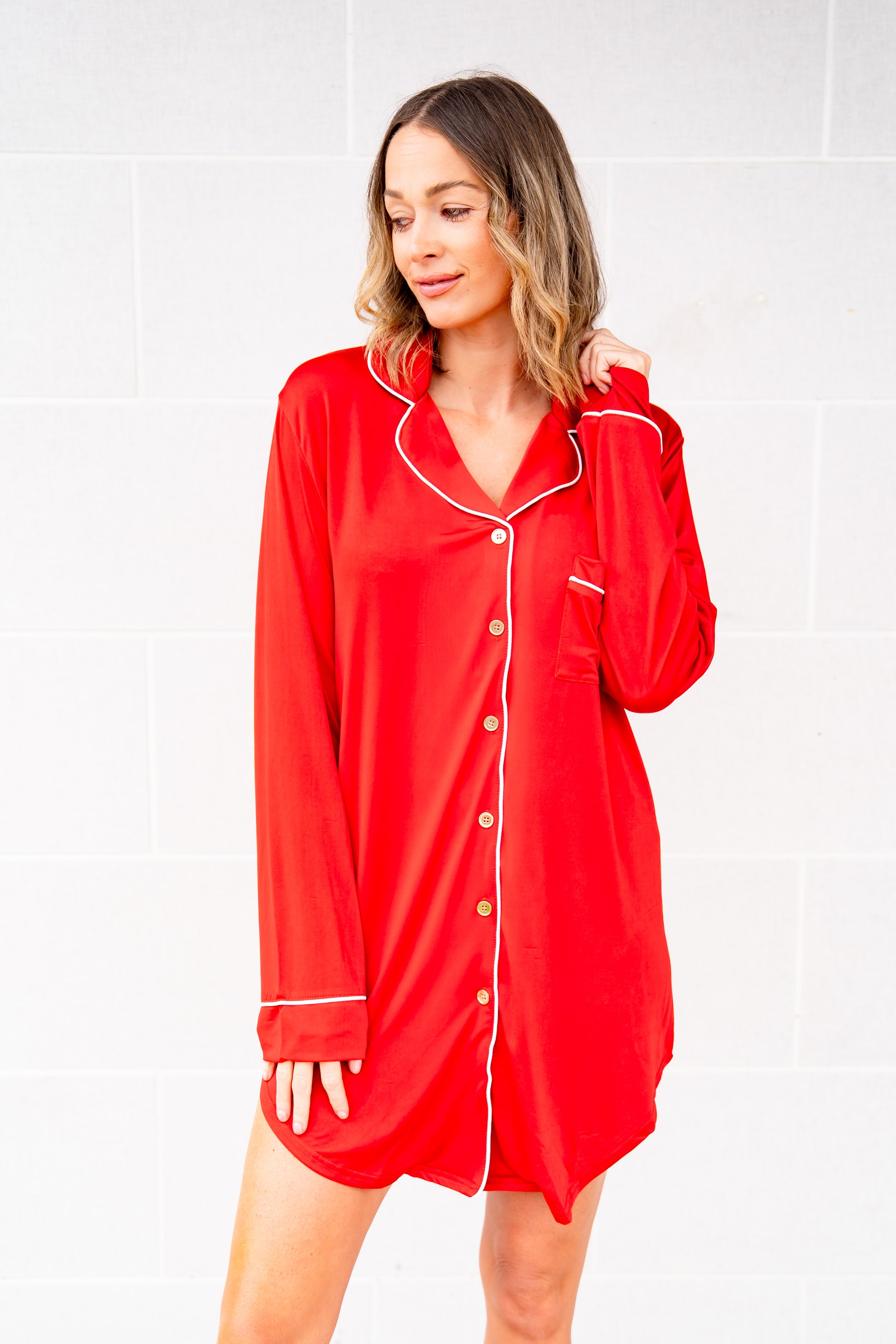 The Buckley Patrick Gown feels just like sleeping in your boyfriend’s oversized shirt! Featuring a button-down front with sparkling gold buttons and long sleeves highlighted by playful contrast piping, this gown offers a relaxed, breezy fit. Its mid-thigh length adds a flirty touch, making bedtime cozy yet stylish—all available in fun colors to suit your night vibes.