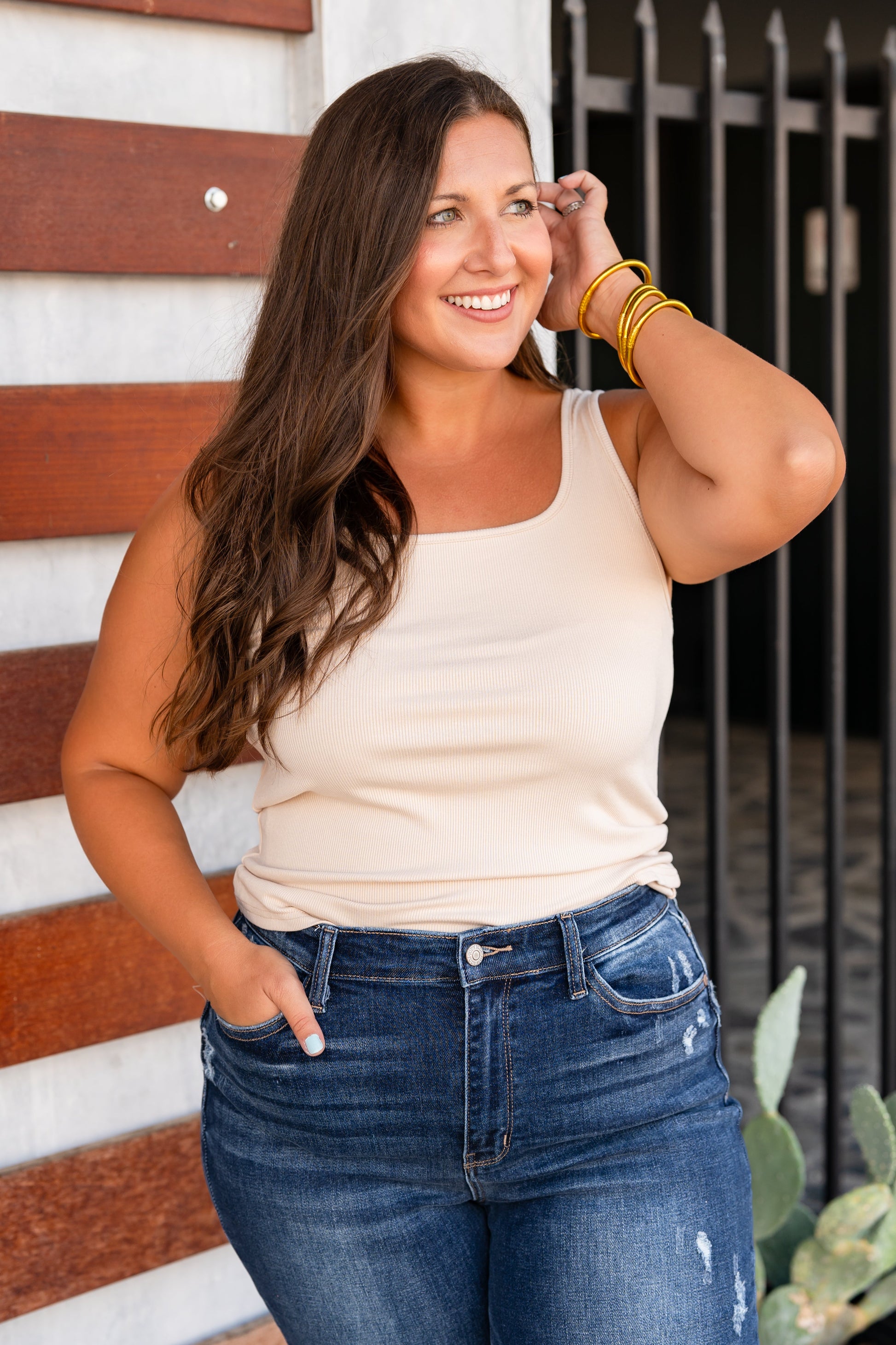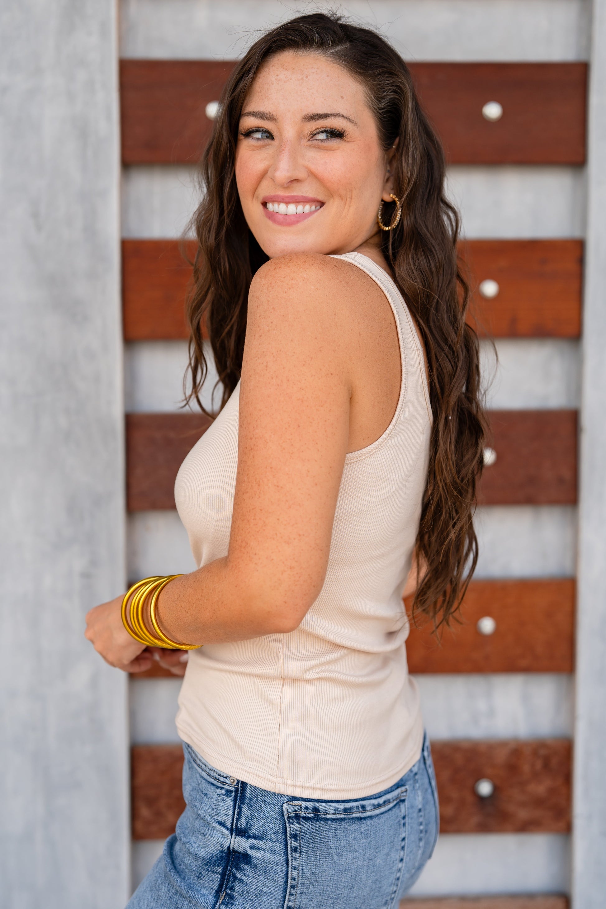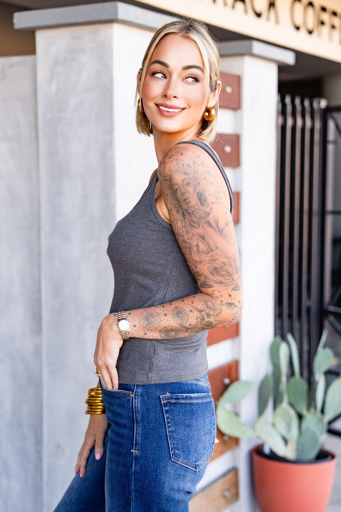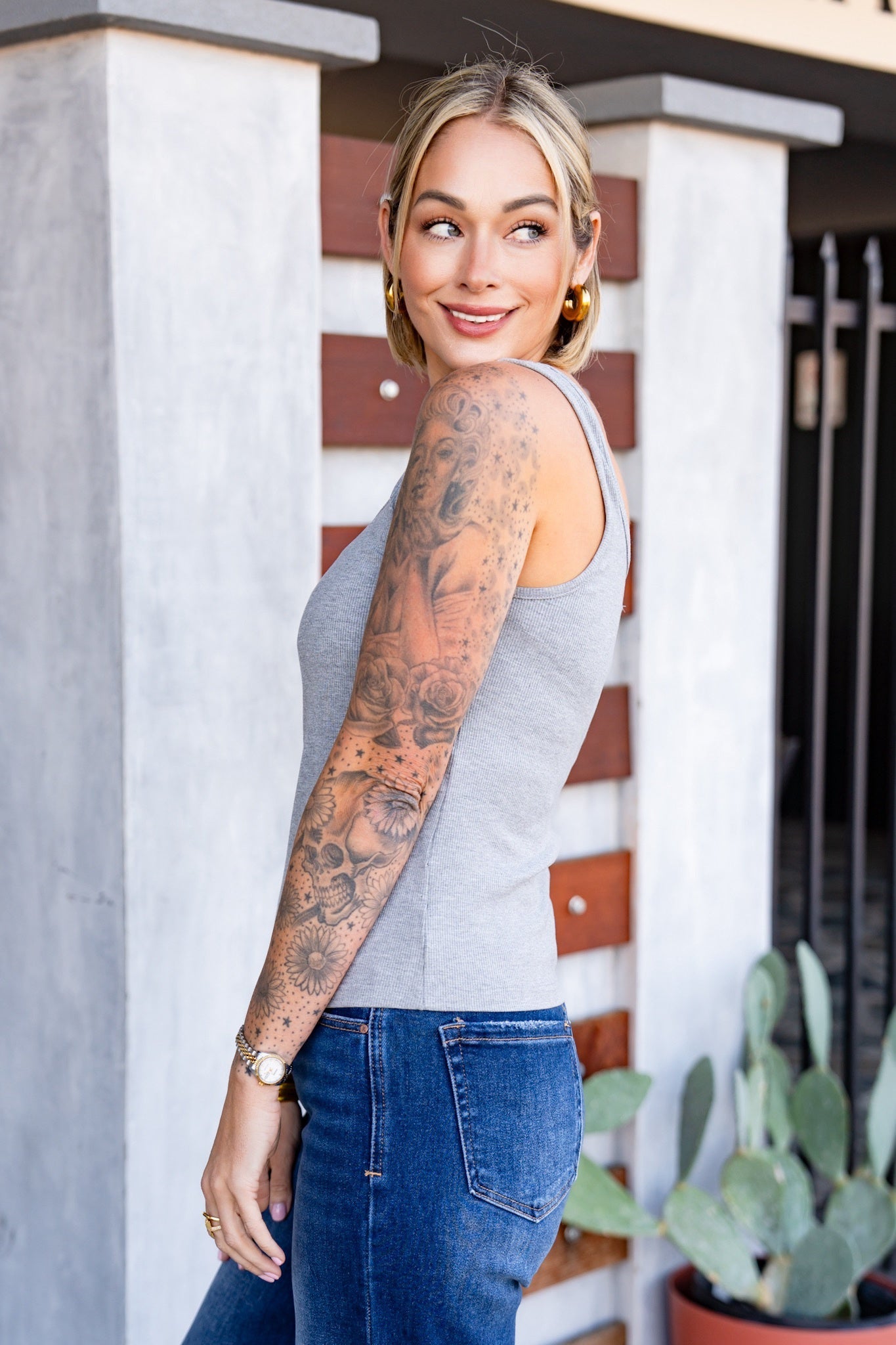 The Ultimate Tank is the timeless staple your wardrobe has been missing. Crafted from our signature ultra-stretchy ribbed fabric, this tank is designed for both comfort and versatility. The flattering scoop neckline and high-cut sides provide the perfect fit, ensuring full coverage while keeping things sleek. With just the right length"€�not too long, not too short"€�it looks effortless whether worn out or tucked in. Plus, the thick straps actually cover your bra, making it the ultimate layering essential. Transition seamlessly into spring and summer with a tank that' s as easy to style as it is to love.