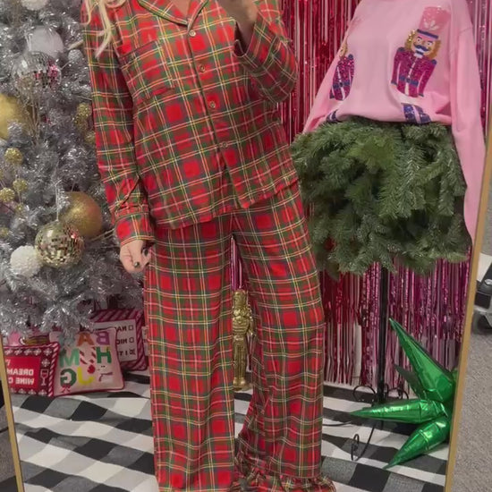 The Buckley Charlotte Set blends classic charm with feminine flair. Featuring a long-sleeve button-down top with shiny gold buttons and a comfortable elastic waistband, this set pairs perfectly with pants finished with a playful ruffle at the hem. It’s the perfect outfit to bring a little fun to your everyday bedtime look.