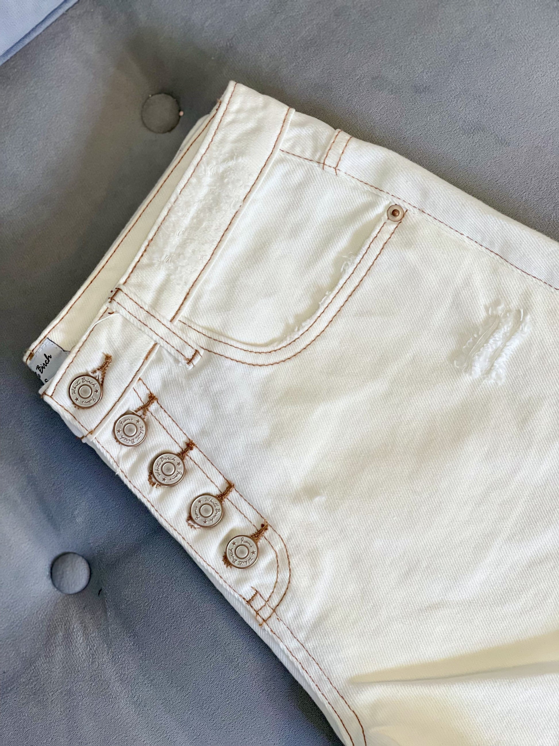 A high-rise solid woven denim shorts with a button up fly front featuring side pockets and distressed detail. Fabric is a lightweight denim. Whitney is in the small. True to size and ready to ship!