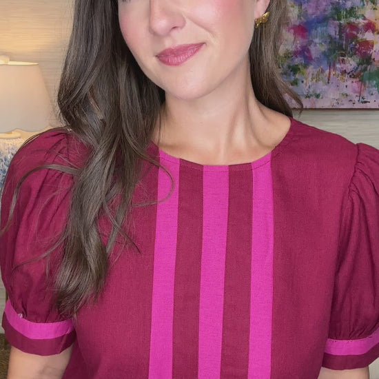 The Caprock Dress in Burgundy charms with its adorable puff short sleeves and playful contrast stripe details. Perfect for adding a fun pop of personality, this dress brings a lighthearted vibe to any occasion.