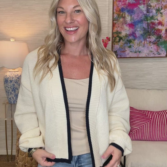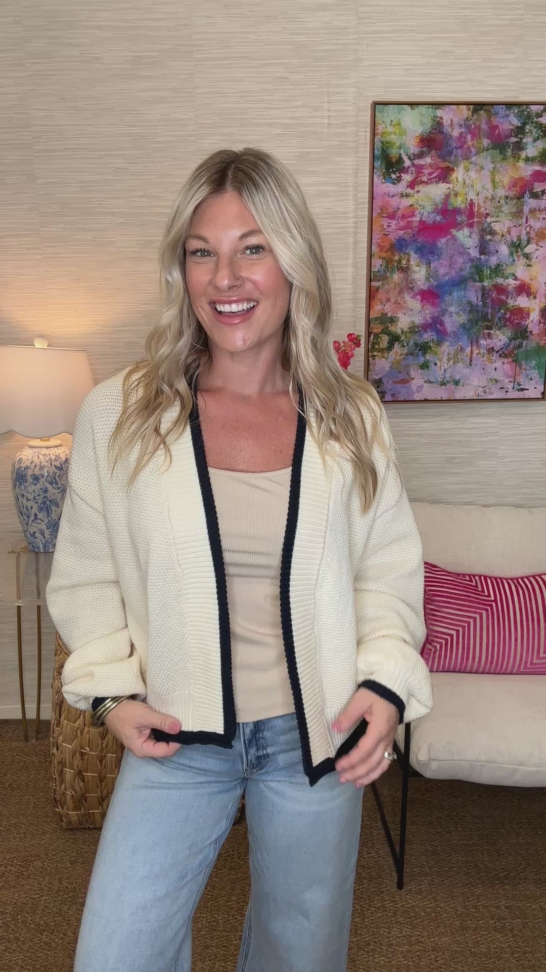 The Carson Cardigan is a charming cream sweater with playful navy trim that adds a fun pop to any outfit. Cozy and stylish, it’s perfect for layering with a touch of spirited contrast.