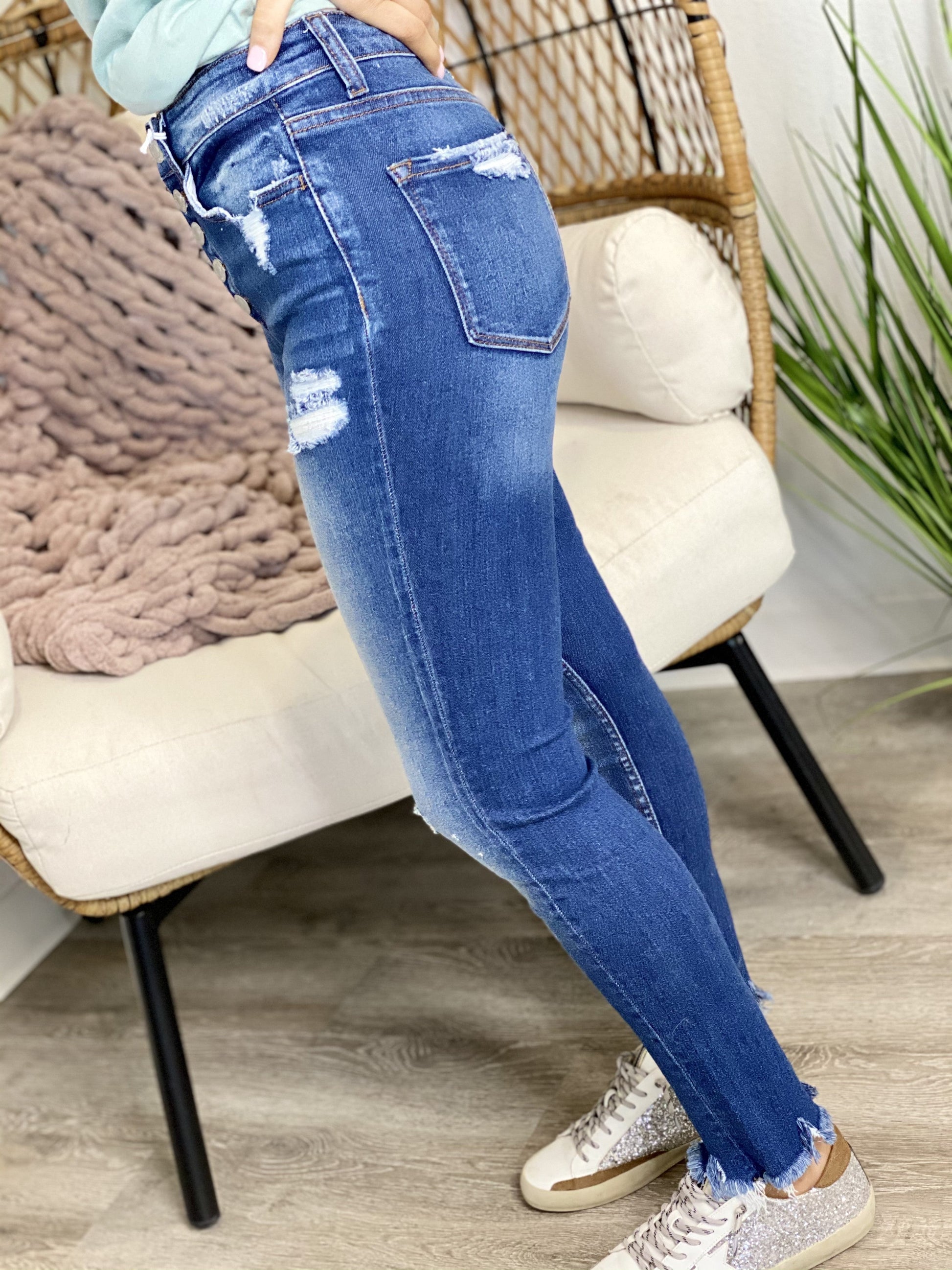 This skinnies are from Vervet and we love that raw hem and the 4 button front! These have a great wash and that top hole on the thigh is patched. Whitney is in her true size 26, Here and ready to ship!