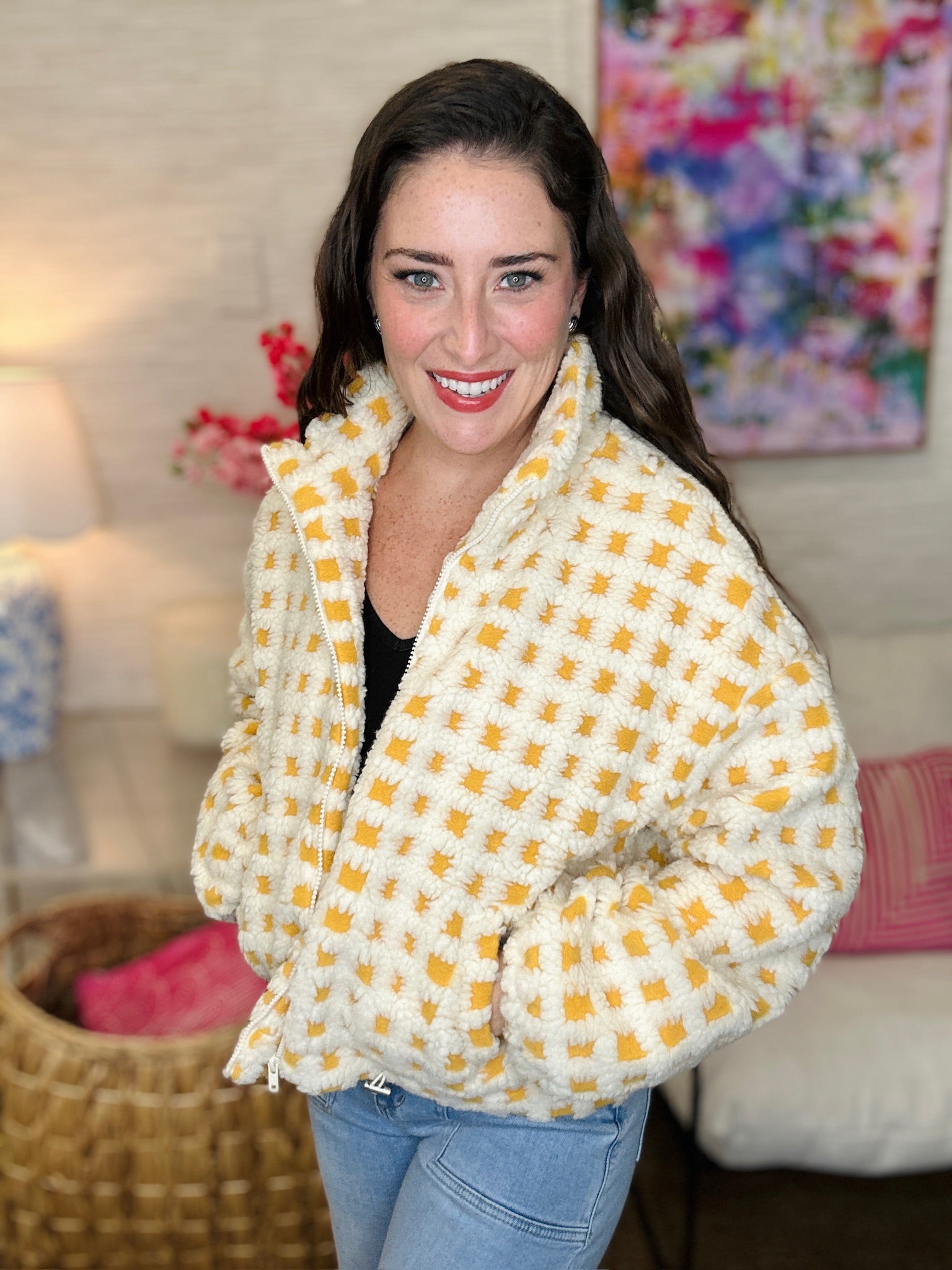 The Checkers Jacket turns up the fun with its cozy sherpa fabric and bold checker pattern. Zipping up has never felt so playful and snug—perfect for adding a quirky touch to chilly days.