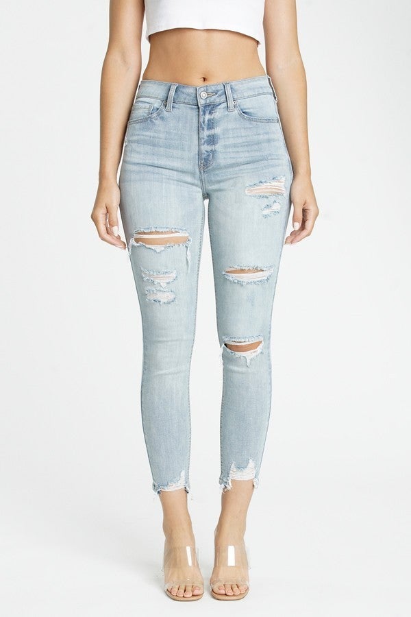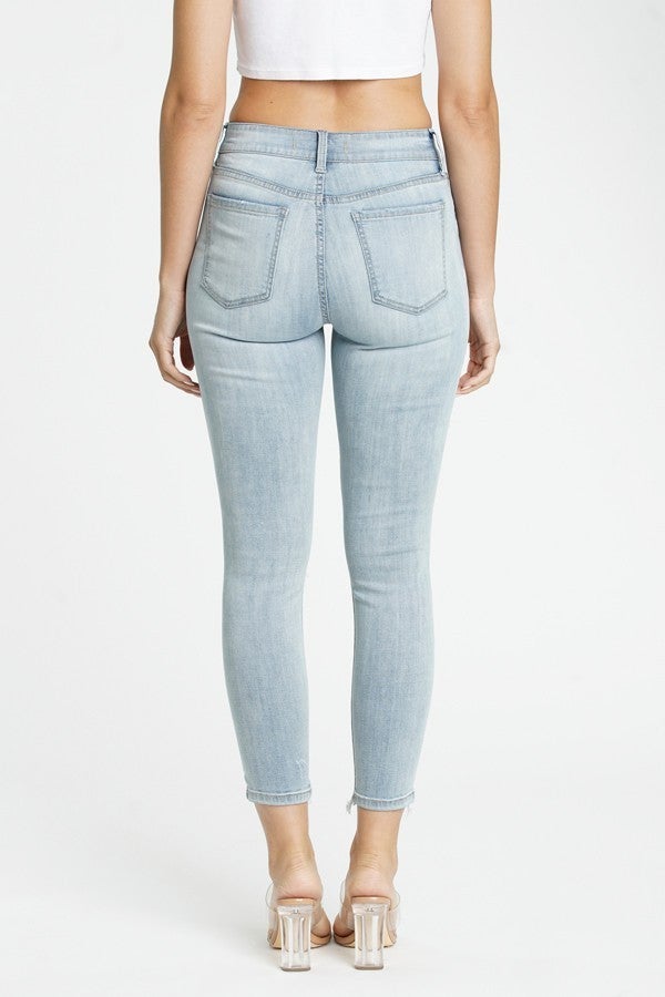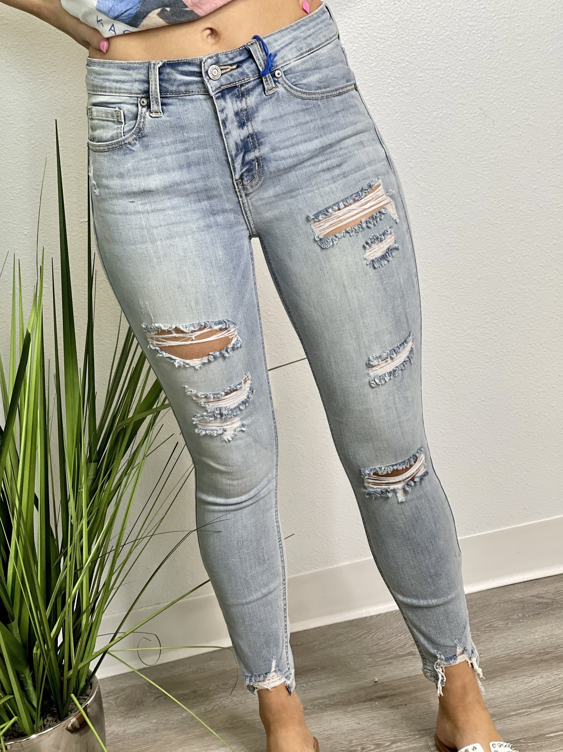 Newest line of jeans to the PDA - Eunina! Light wash skinny jeans with distressing throughout the front and hem. Five-pocket design, belt loops and zip fly button closure. Whitney is in the size 3, true to size! Here and ready to ship!