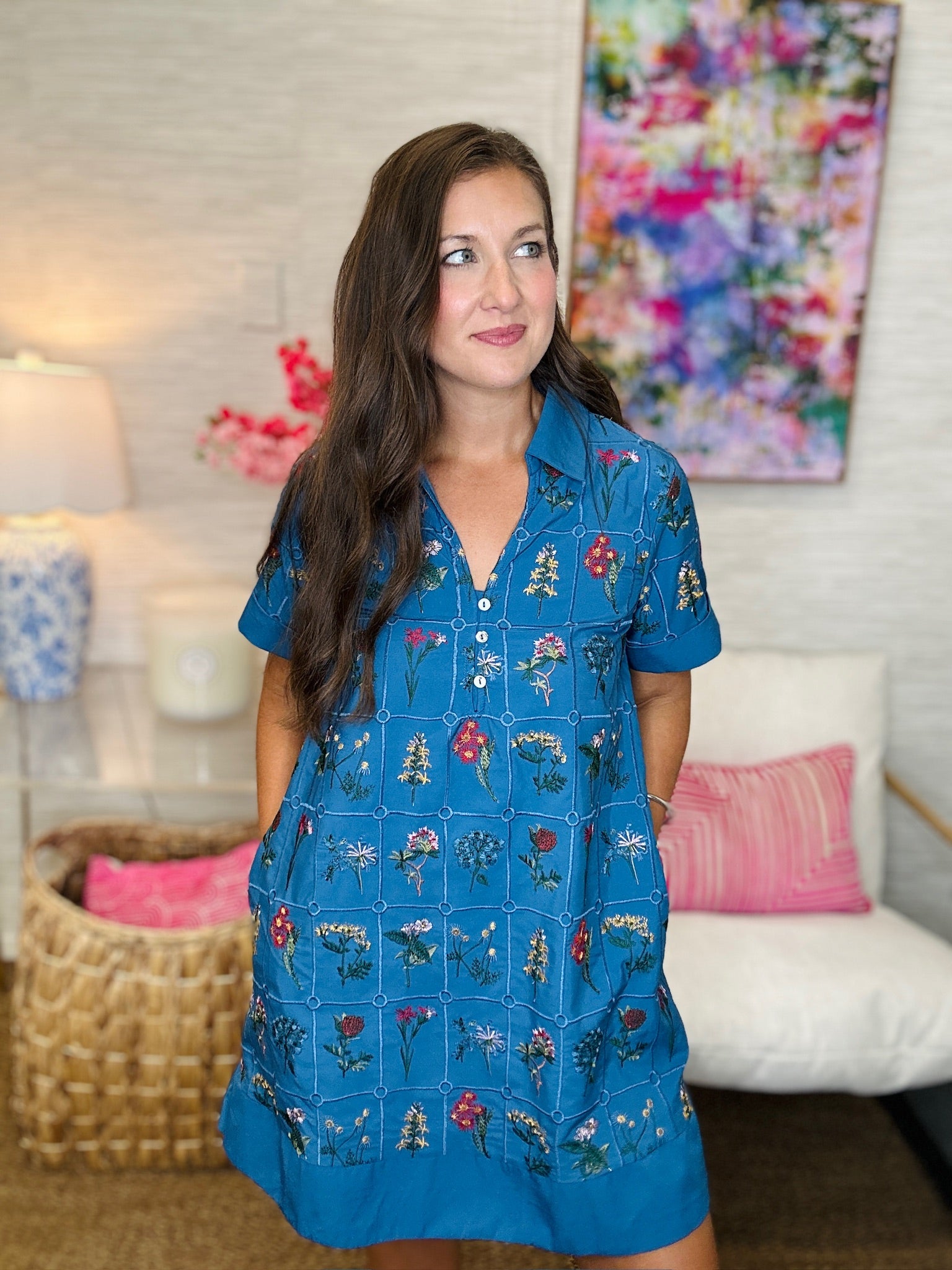The Everblooms Dress in Blue is bursting with playful charm thanks to its gorgeous embroidered floral details. Featuring short sleeves, a flattering V-neck, and a cute three-button accent, this dress adds a flirty touch to any occasion.