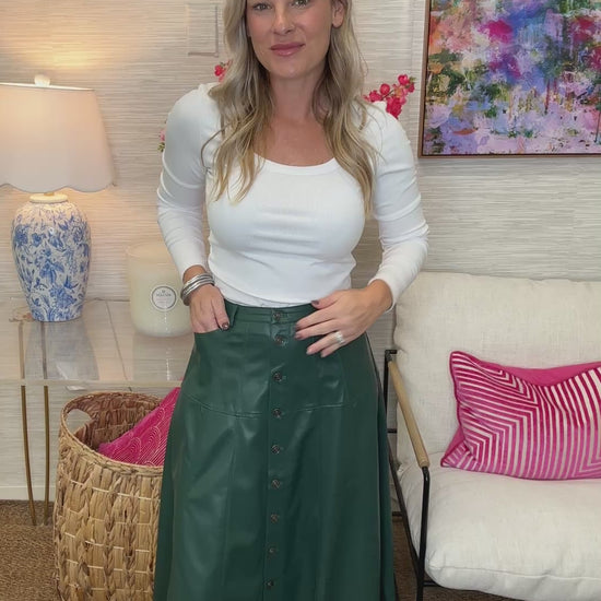 Turn heads with The Faux Midi in Hunter Green, a playful faux leather A-line skirt featuring a trendy button-front design. Its flattering midi length and rich color make it perfect for adding a bold, fun edge to any outfit.