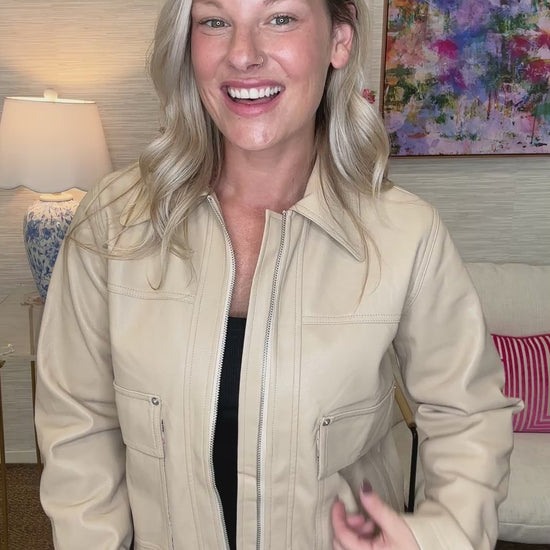 The Faux Sand Jacket brings playful edge to your wardrobe with its sleek faux leather finish and cool front flap pockets. Perfect for adding a bit of attitude to any outfit, this jacket keeps you stylishly comfy day or night.