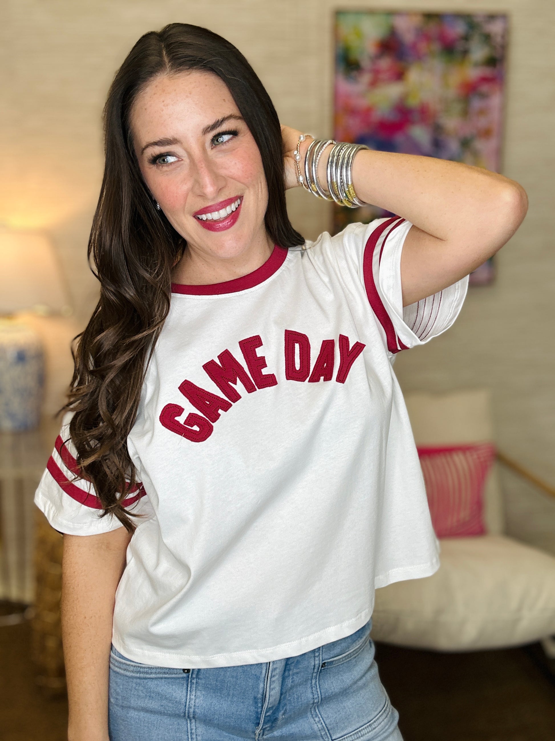 Game day just got a whole lot more fun. This graphic tee celebrates the thrill of competition with bold, eye-catching design that shows your spirited side. Whether you're cheering from the stands or just vibing with fellow fans, this top brings the energy and attitude. Available in three colors so you can pick your perfect match and rep your team in style.