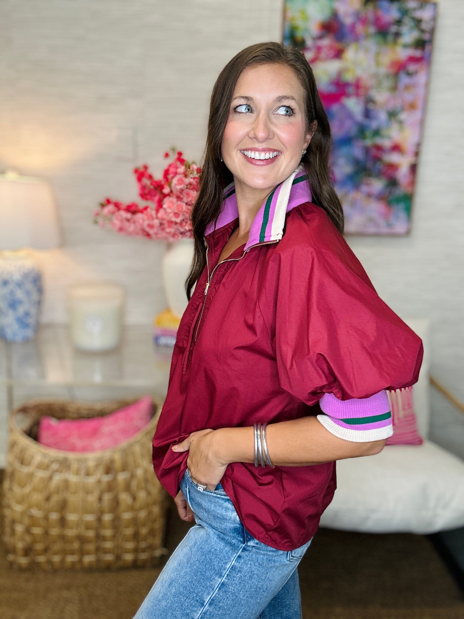 The Gia Top plays with sporty charm thanks to its cute short puff sleeves and a handy half-zip front. Contrasting material with striped collar and sleeve cuffs adds a fun, energetic vibe that's perfect for a playful, on-the-go look.