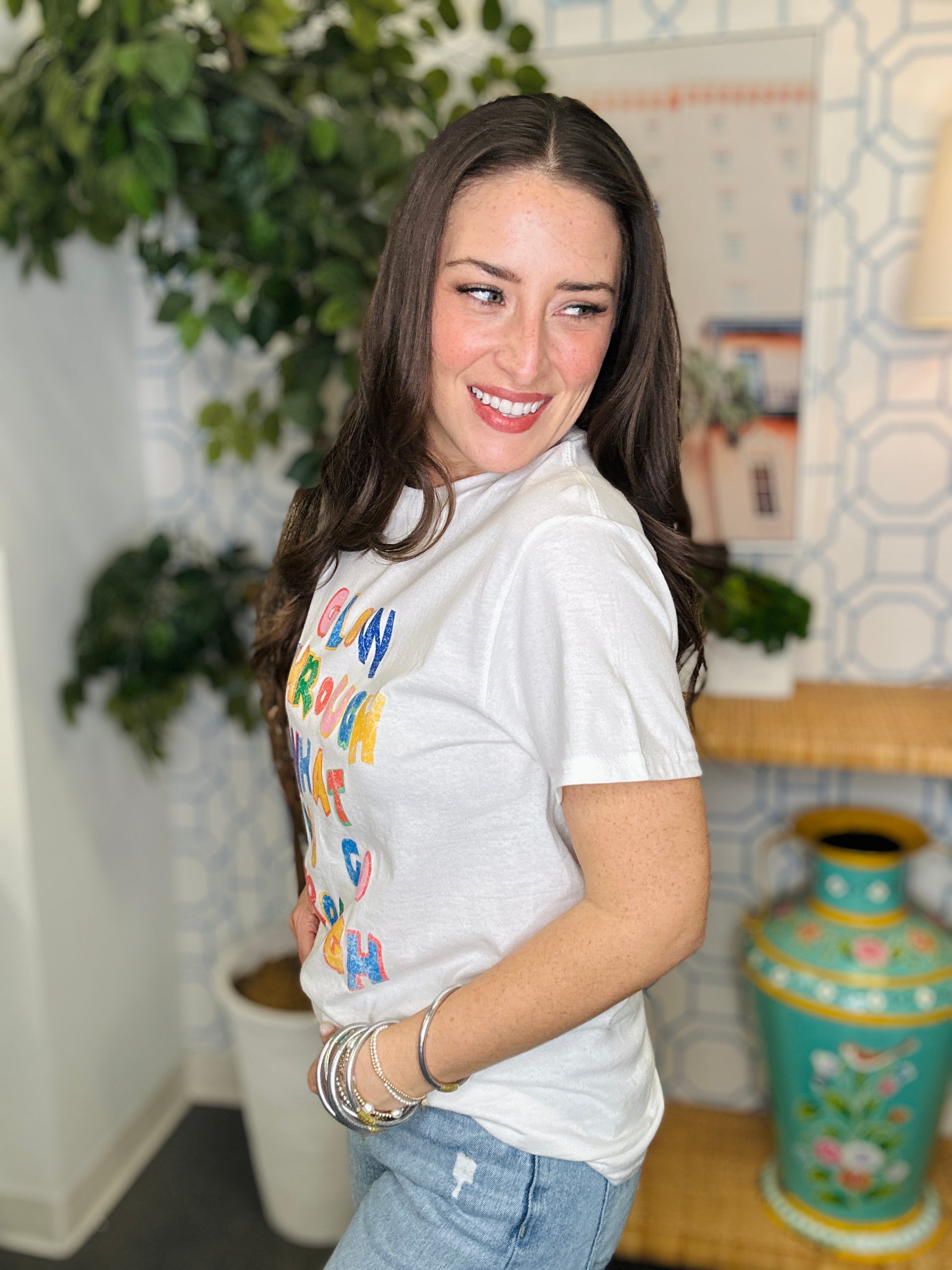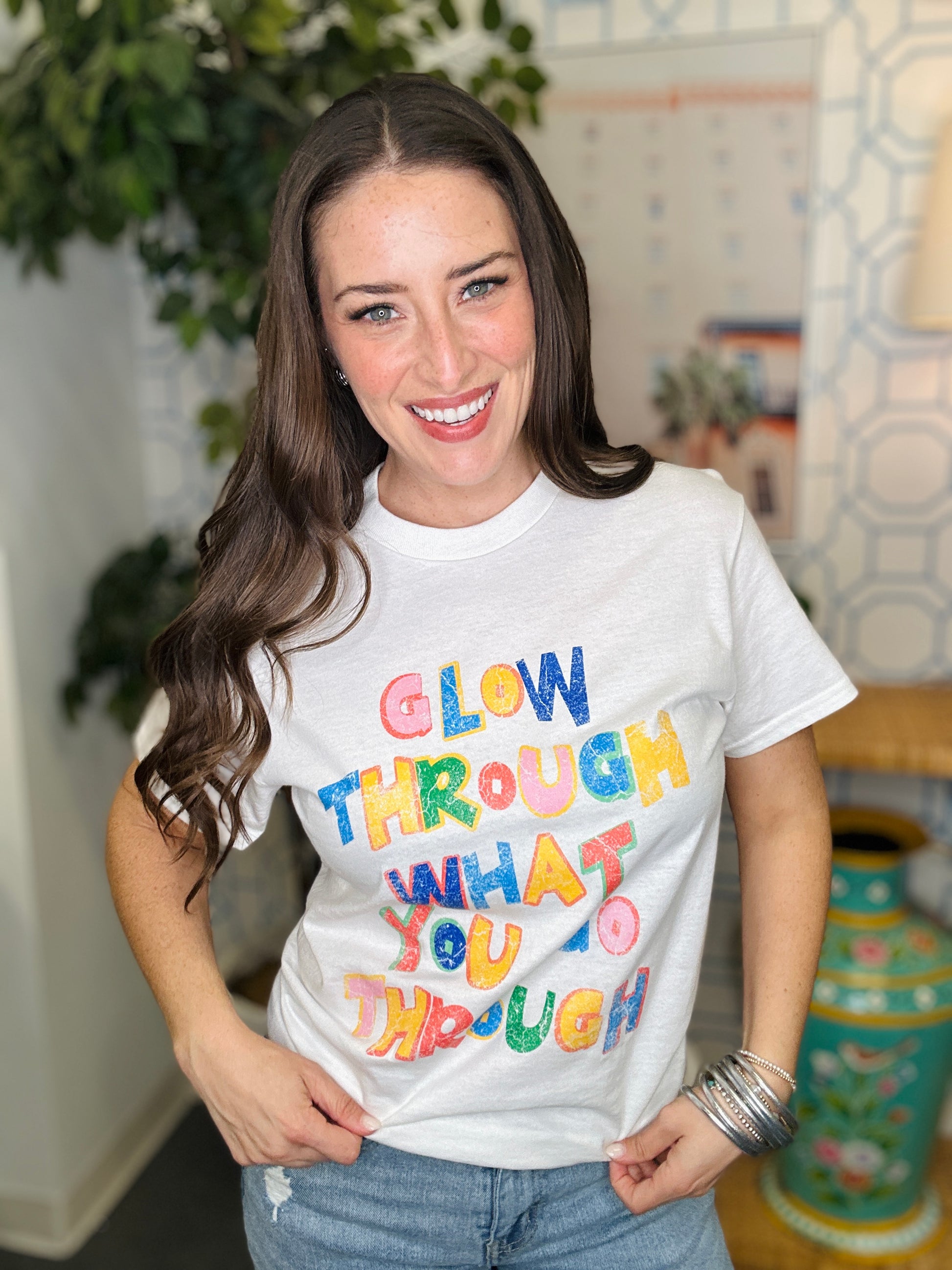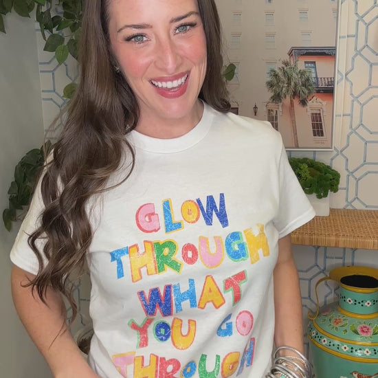 Embrace your inner light with this striking white graphic tee featuring the empowering message "Glow Through What You Go Through." Perfect for everyday wear, this comfortable cotton blend tee serves as a wearable reminder to shine bright even during life's challenges. The bold, eye-catching graphic makes a statement while the classic white base pairs effortlessly with any outfit. Whether you're looking for meaningful apparel or a gift for someone who inspires you, this tee delivers both style and substance.