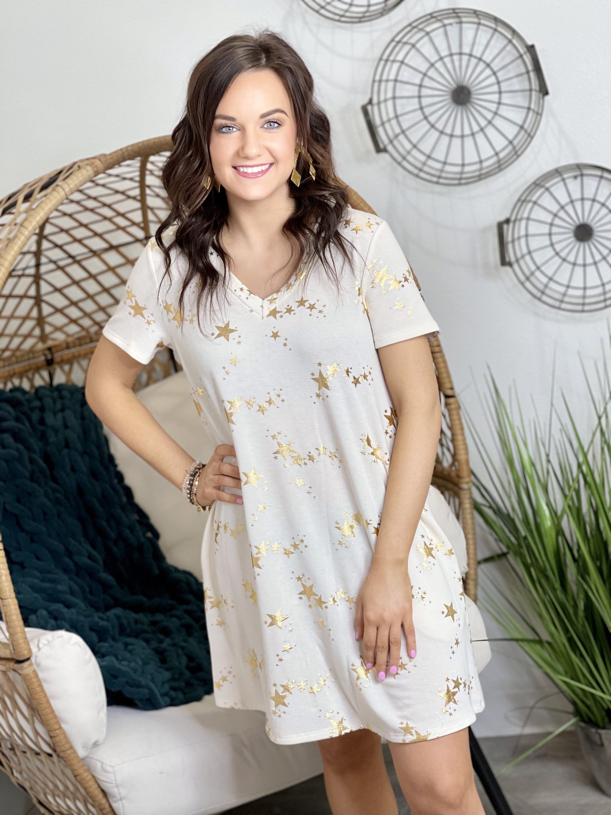 We love this gold star print from Adrienne and you will not want to take this dress off! So comfy and cozy and has pockets! Whitney is in the small, True to size! Here and ready to ship!