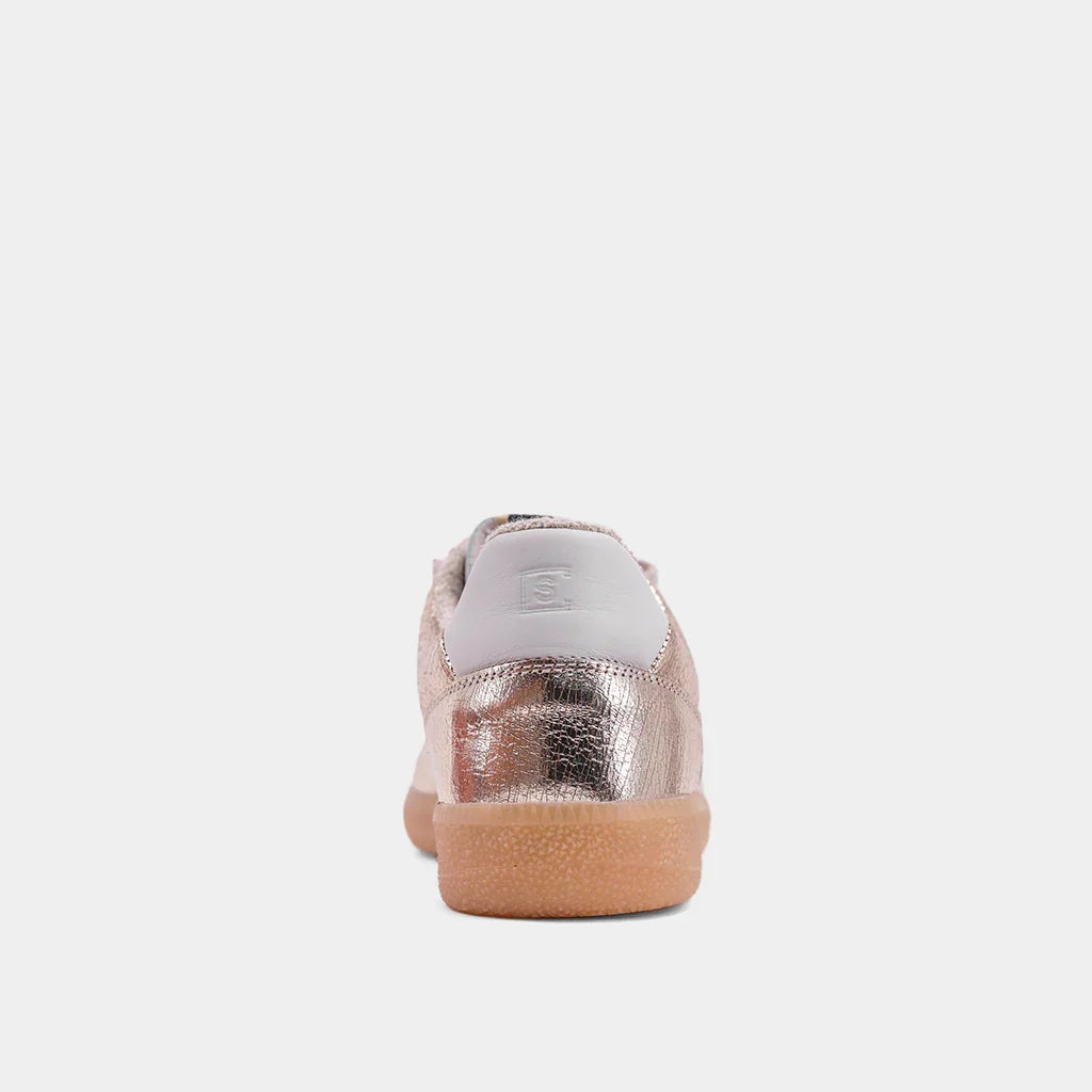 The SYLVIA in Gold brings glam to the streets. Made in Spain using genuine cracked gold leather, this sneaker is part of our exclusive capsule designed for elevated off-duty dressing. With its rich metallic finish, neutral contrast panels, and retro gum sole, this pair proves shine and style can go hand in hand.