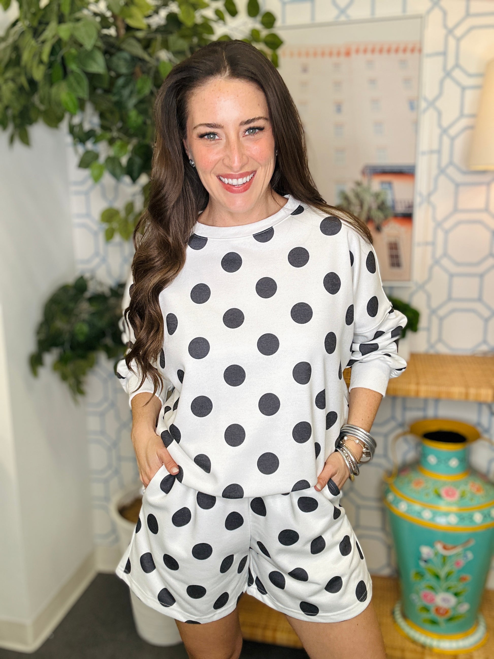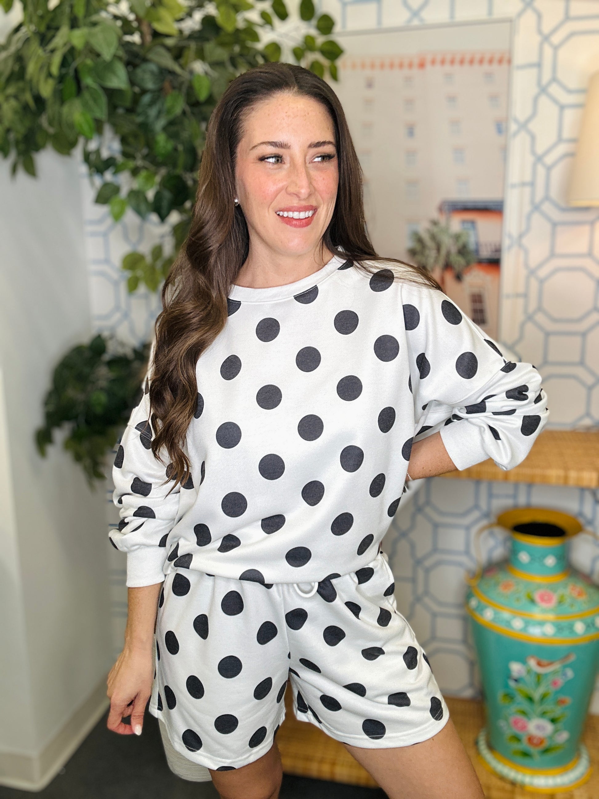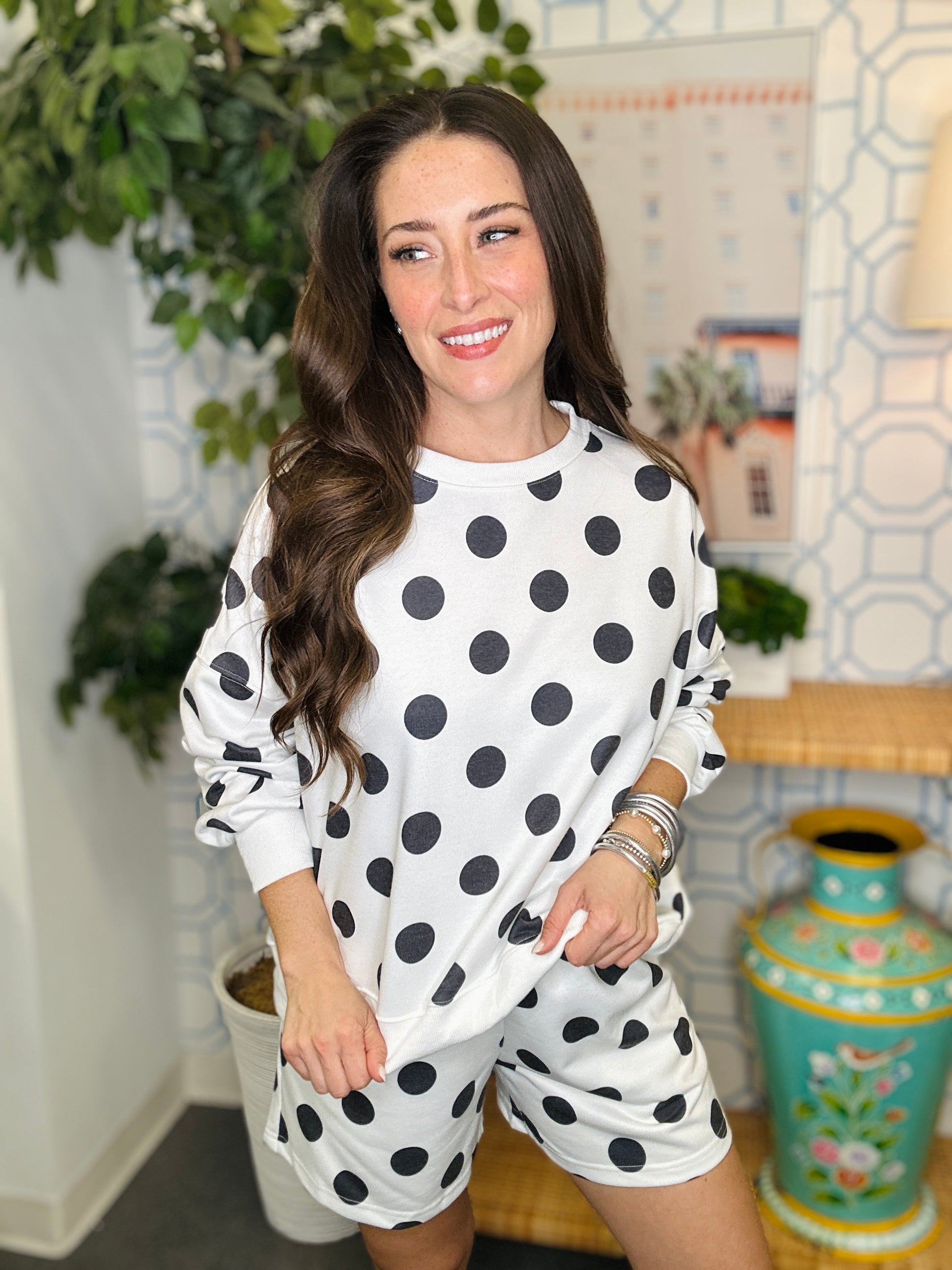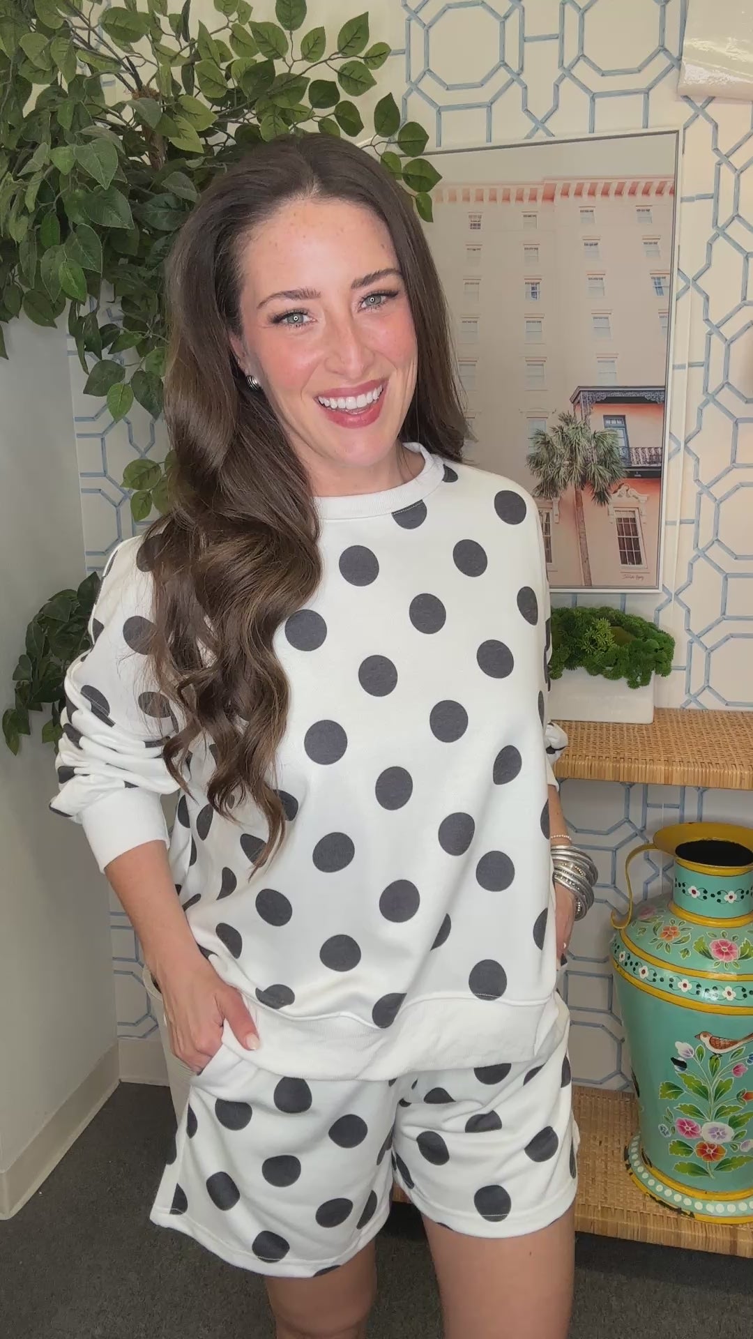 Effortless comfort meets playful style with this two-piece set. The boxy pullover features a relaxed fit and classic black polka dots on a crisp white base, while the coordinating drawstring shorts offer a casual, laid-back vibe. Perfect for lounging at home or running errands, this set delivers understated charm with a touch of retro flair. Mix and match with your favorite basics for endless styling possibilities.