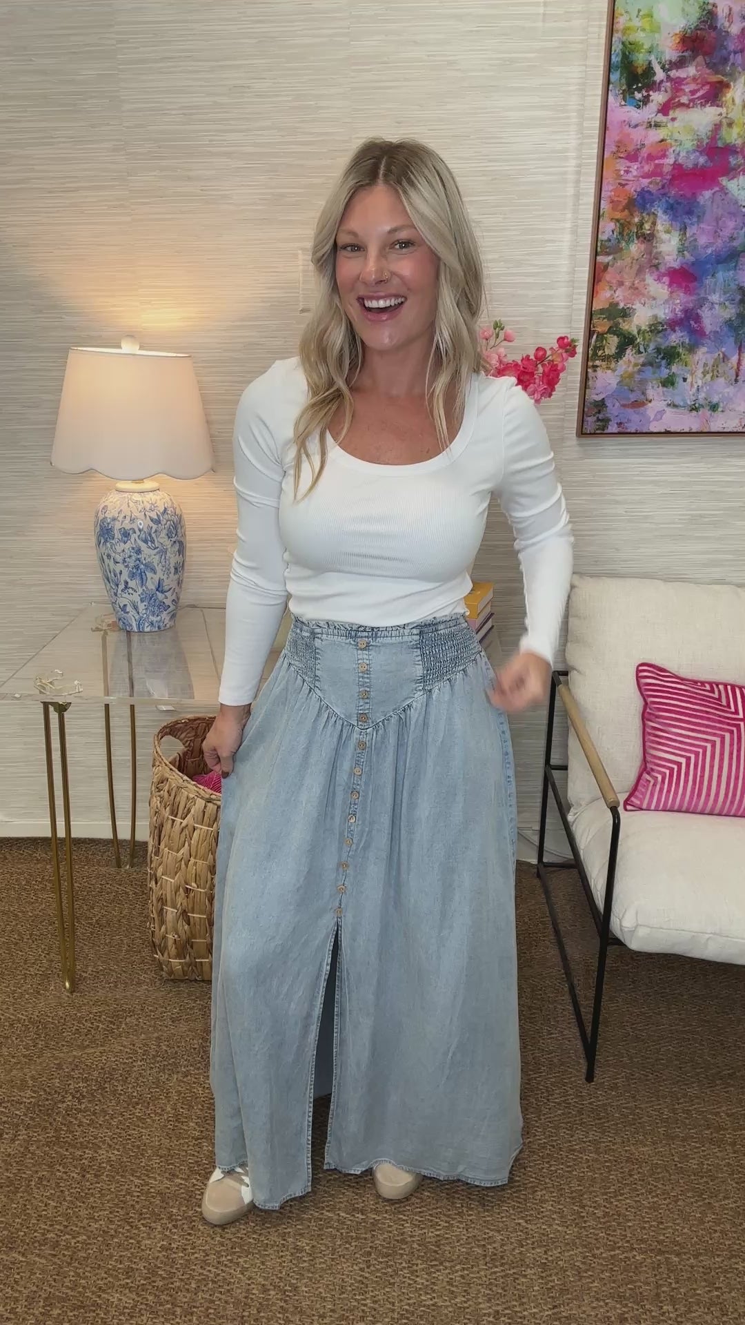 Step out in style with The Gretchen Maxi Skirt! This playful denim skirt features a front slit for easy movement and a flirty vibe. Perfect for mixing casual comfort with a fun, fashion-forward twist.