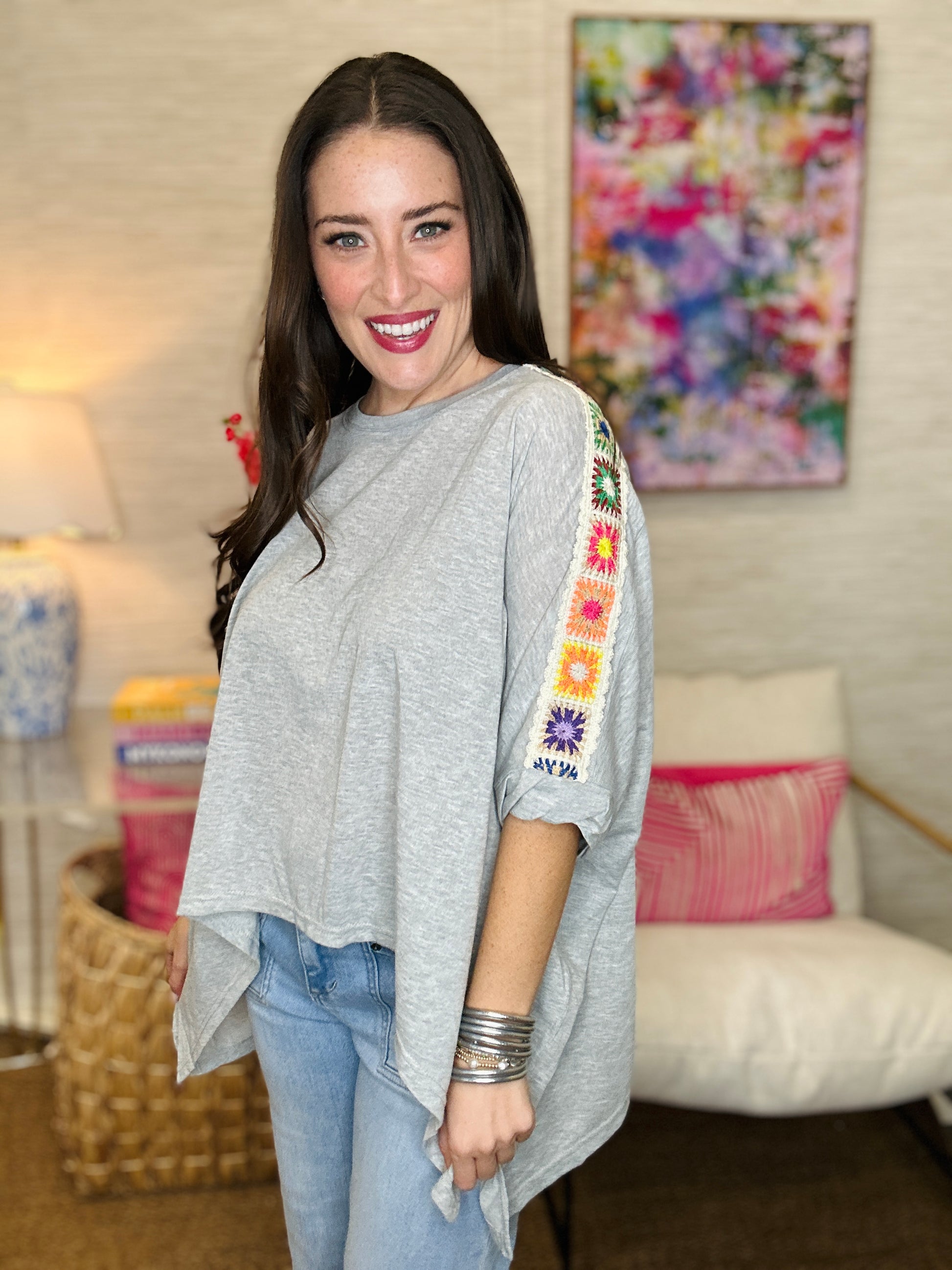 The Greyer Top Flowy, fun, and totally unique—this poncho-style top is your ticket to effortless boho vibes. The clever cut sits higher in front while cascading longer on the sides, creating movement and dimension that'll have you feeling like you're floating through your day. Colorful crochet patches dance along the arms, adding handmade charm and personality that screams "I have great taste." Comfortable enough for all-day wear and interesting enough to turn heads, it's the kind of piece that makes getting dressed actually fun.