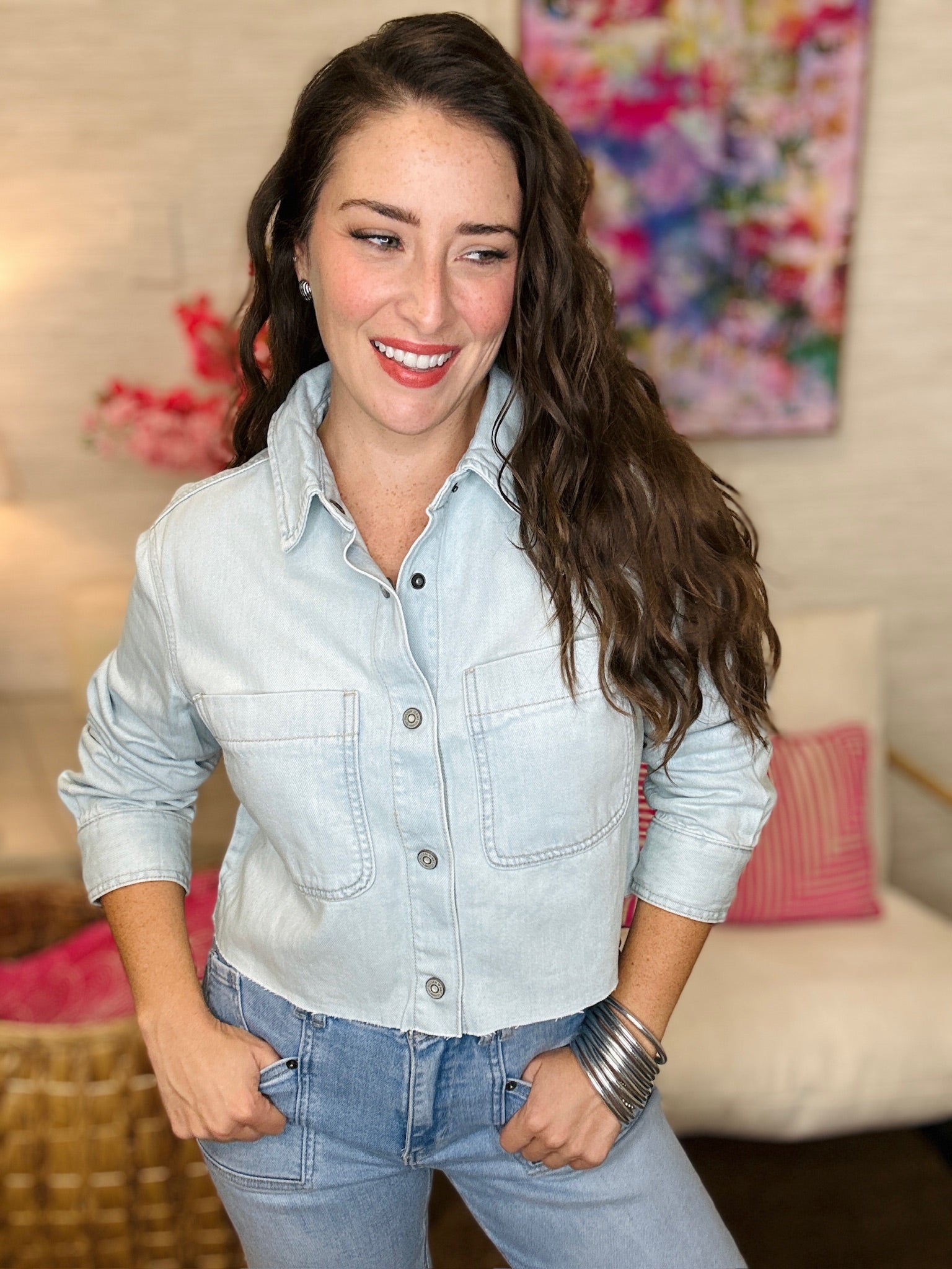 Introducing The Hidden Crop—the versatile denim piece that does double duty. This light-wash button-up works as a chic crop top or a jacket, depending on your mood and outfit goals. Long sleeves keep things polished while the cropped silhouette adds a modern twist. Pair it with high-waisted bottoms for a classic look, or throw it over a dress for instant edge. One piece, endless styling possibilities—now that's what we call a wardrobe win.