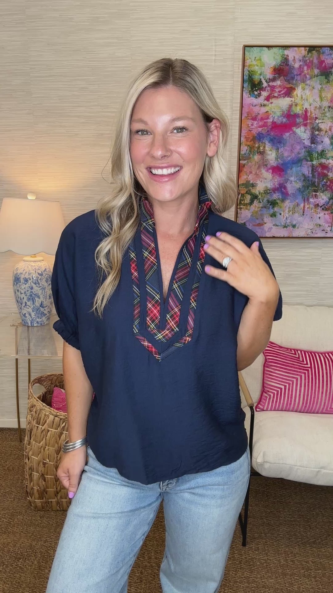 This lightweight blouse in flowing solid navy combines comfort with playful style. Featuring a tartan plaid trim along the V-neck front, it adds a festive touch. Balloon short sleeves with elastic bands create a fun, airy silhouette perfect for any casual or holiday occasion.