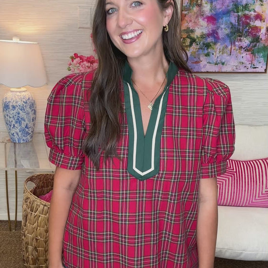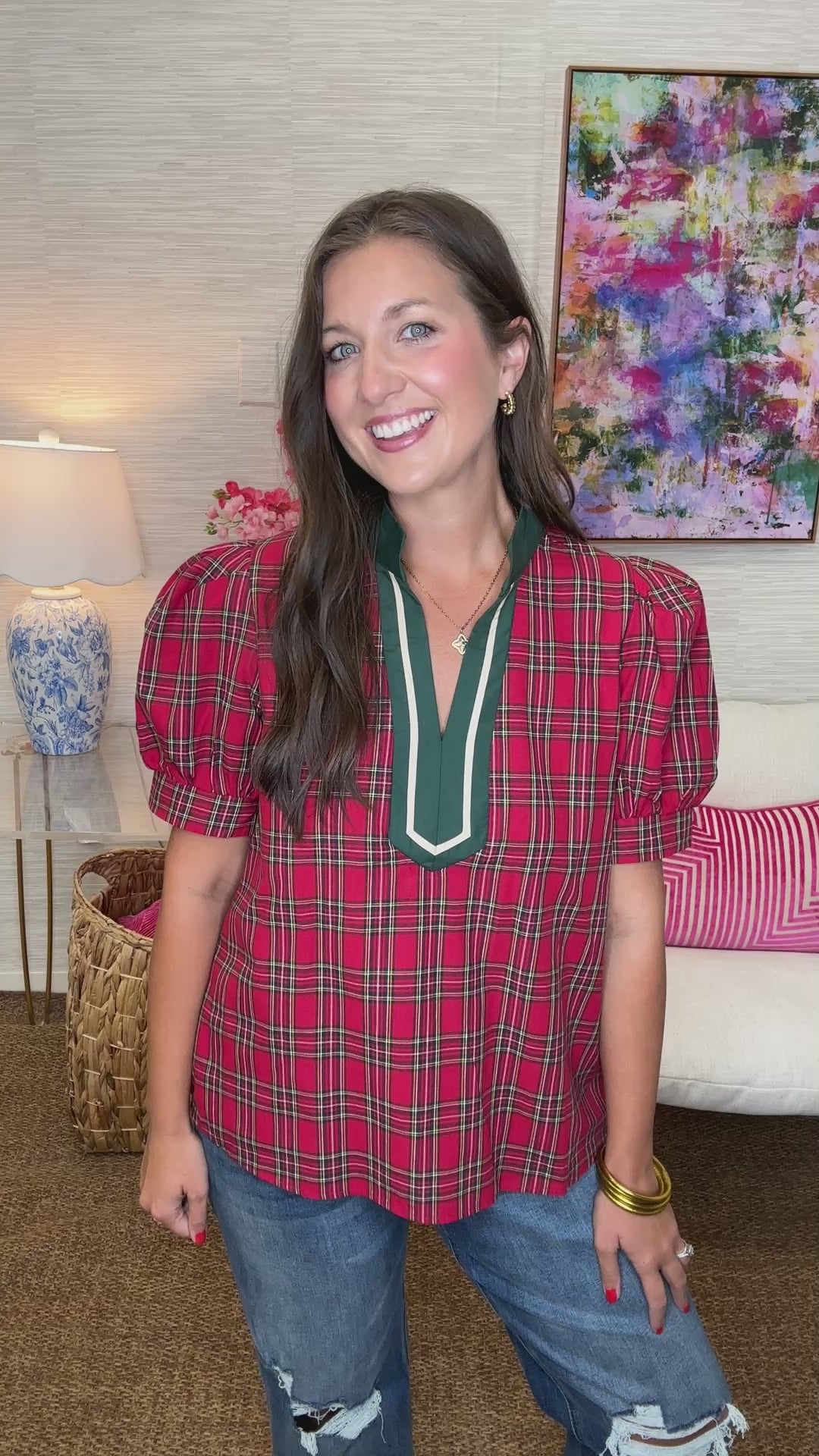 e Hollyhock Top brings a playful twist to classic tartan plaid with its short puff sleeves and eye-catching dramatic details on the V-neck and collar. This top combines timeless pattern with fun design elements, making it a standout piece for any casual or dressy occasion.
