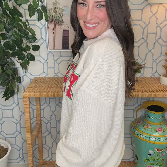 This casual comfy pullover in creamy soft knit features "Merry Christmas" spelled out in cheerful red and green—the perfect way to spread seasonal cheer. Slip it on for cozy family gatherings or those quiet moments by the fire. The relaxed fit and festive design make it an instant favorite that celebrates the magic of the season.
