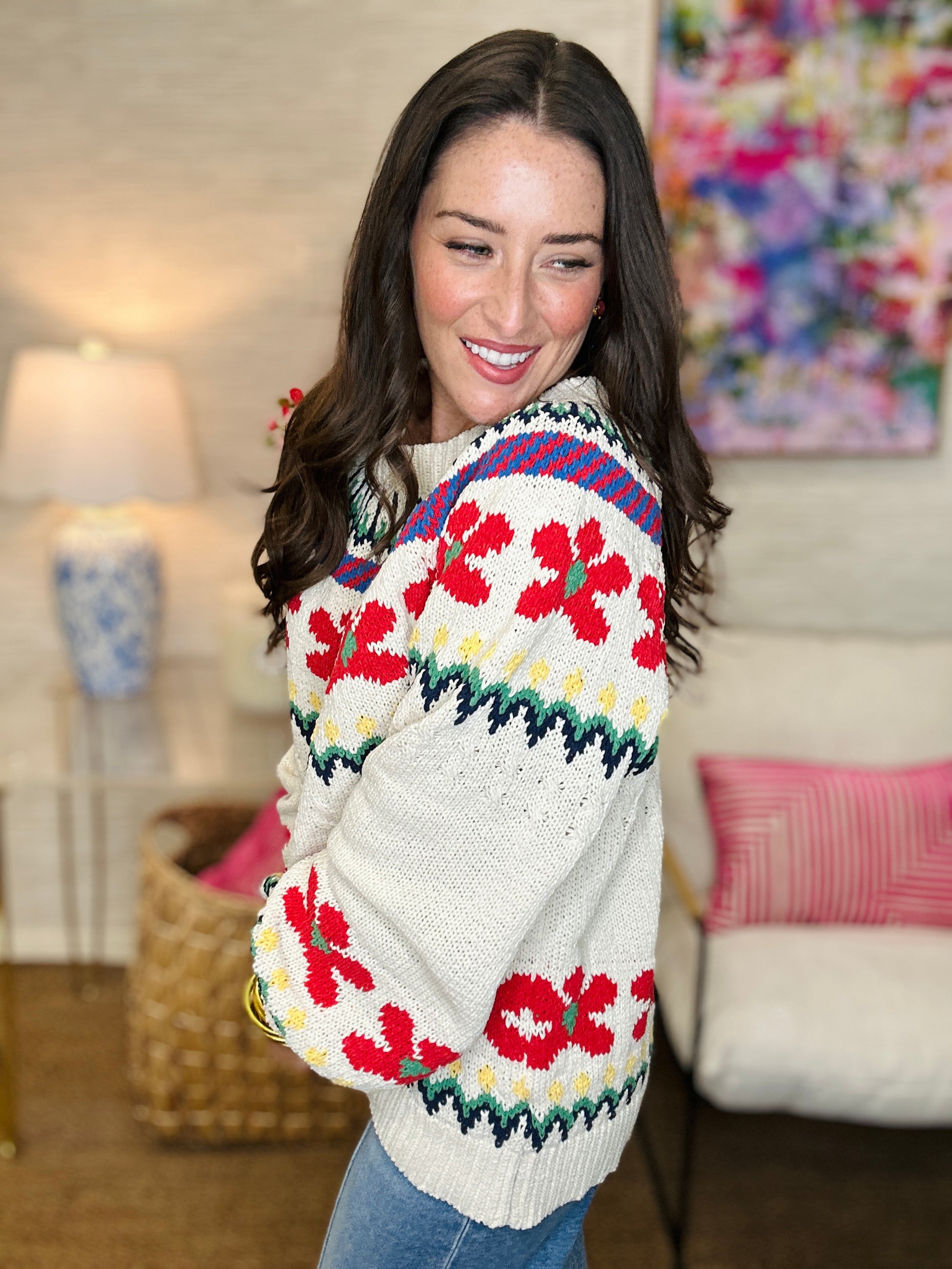 Designed in Round Neck, Raglan Sleeve, Relaxed Fit Top in Chenille Sweater Pointed Floral Pattern.