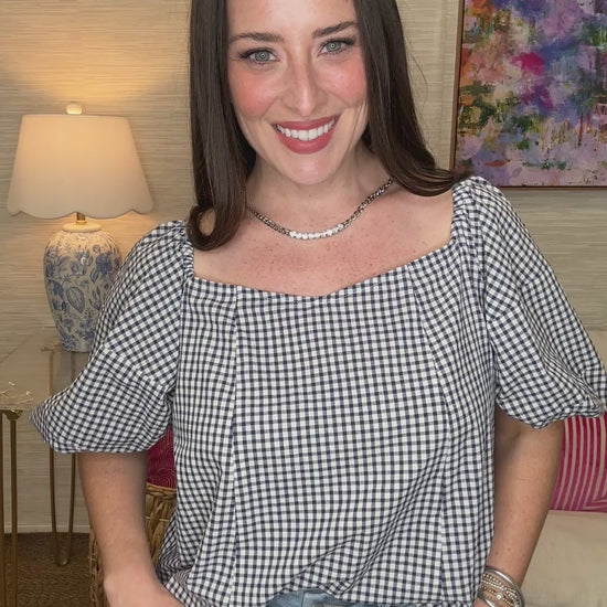 The Jenny Top is a flirty statement piece that brings instant fun to your wardrobe. This charming off-the-shoulder crop top features a classic navy and white check pattern that never goes out of style, paired with playful balloon sleeves that add movement and personality. Perfect for showing off your style at casual hangouts, date nights, or whenever you want to feel a little extra confident and cute. Mix and match with your favorite bottoms for endless outfit possibilities.