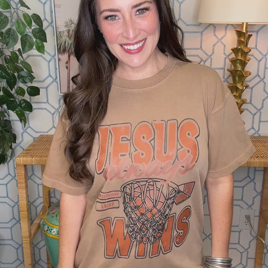 Nothing but net with the Jesus Always Wins Tee! This bold graphic tee combines faith and fun with a striking basketball hoop design that speaks volumes. Whether you're hitting the court or just living your best life, this piece celebrates victory, belief, and unstoppable spirit. Comfortable, meaningful, and totally wearable, it's the kind of tee that makes a statement while keeping you cool and confident. Shoot your shot in style!