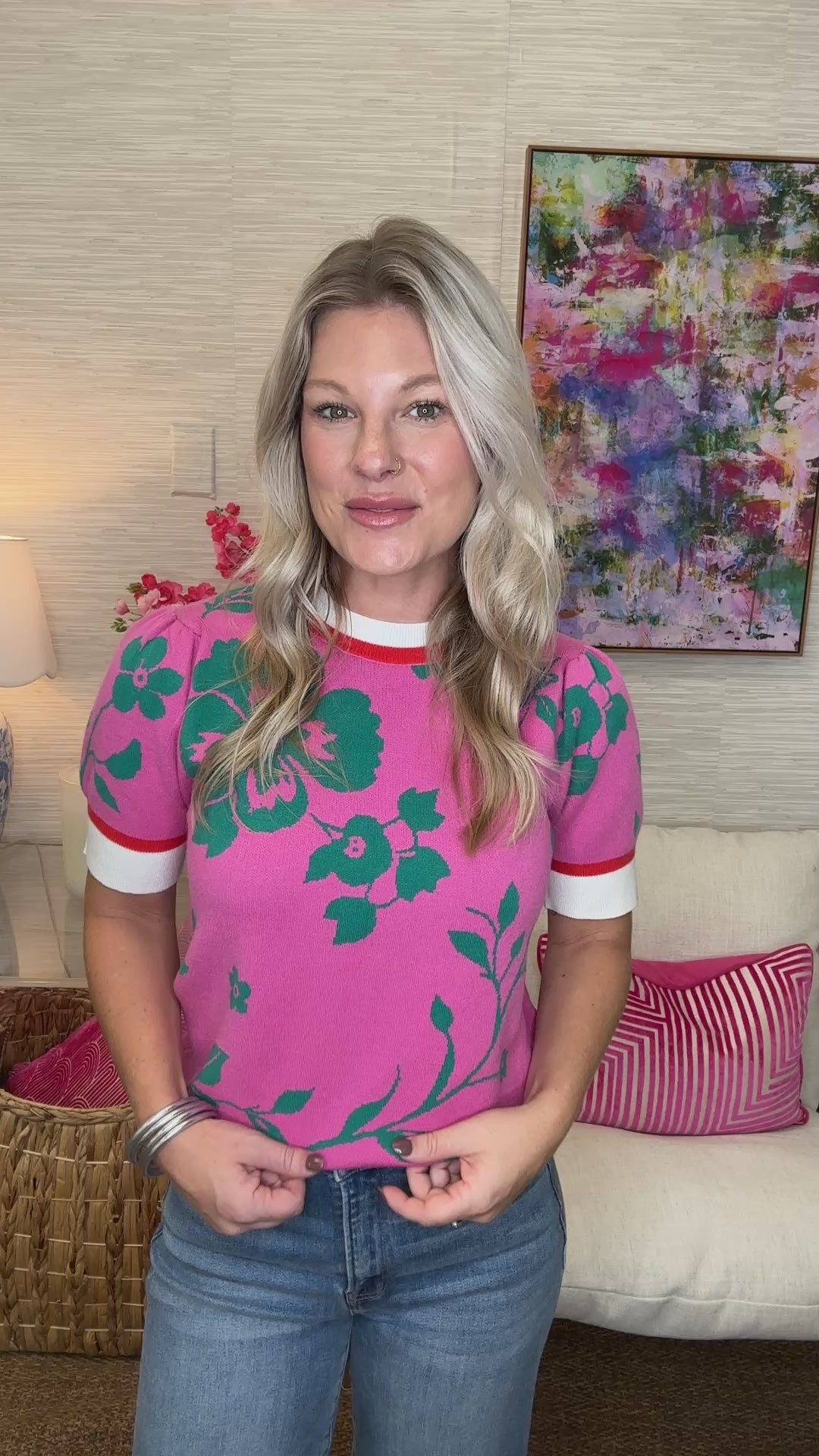 Floral Pattern Jacquard Knit Short Puff Sleeve Sweater
